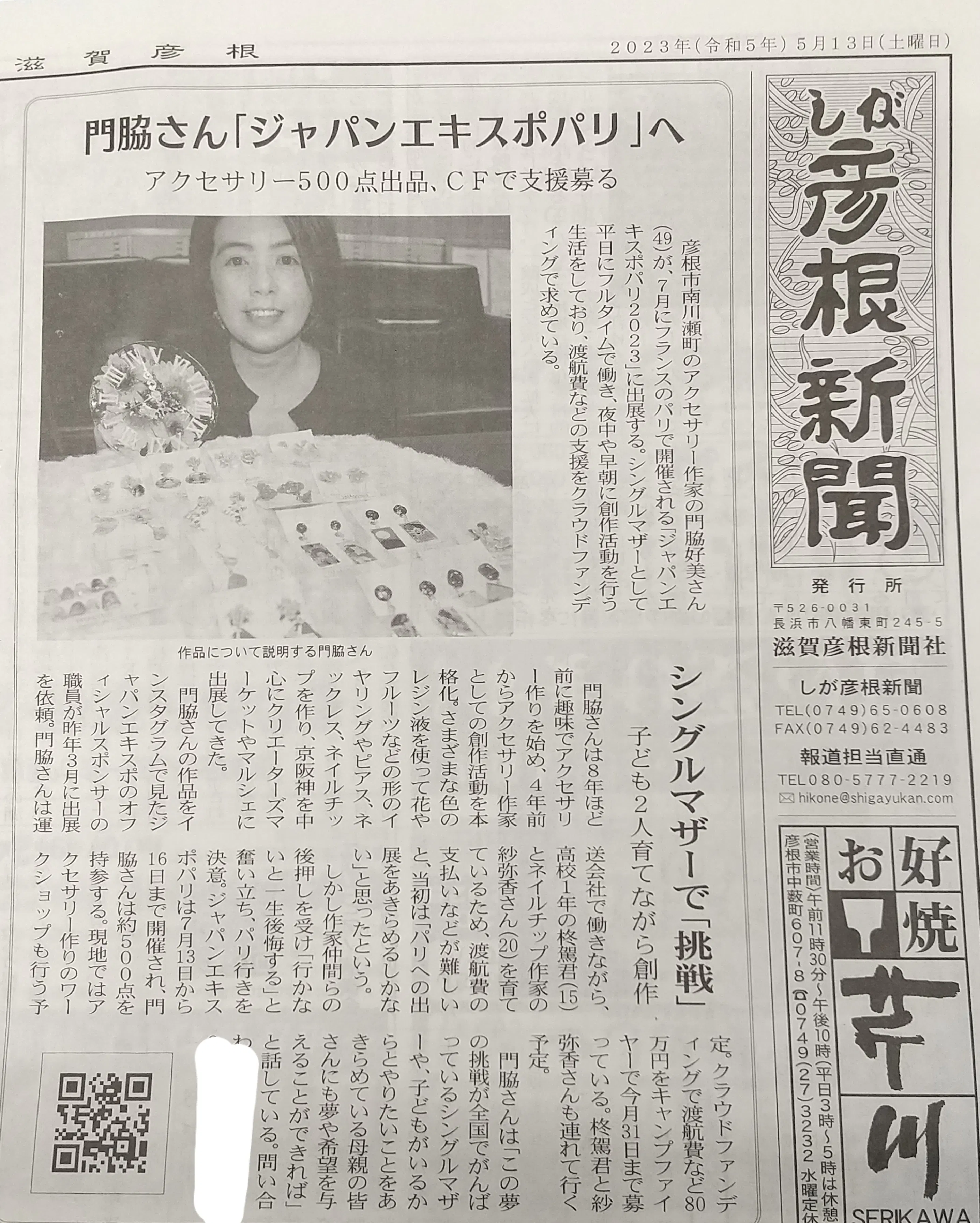 5月13日の滋賀彦根新聞に掲載して頂きました。