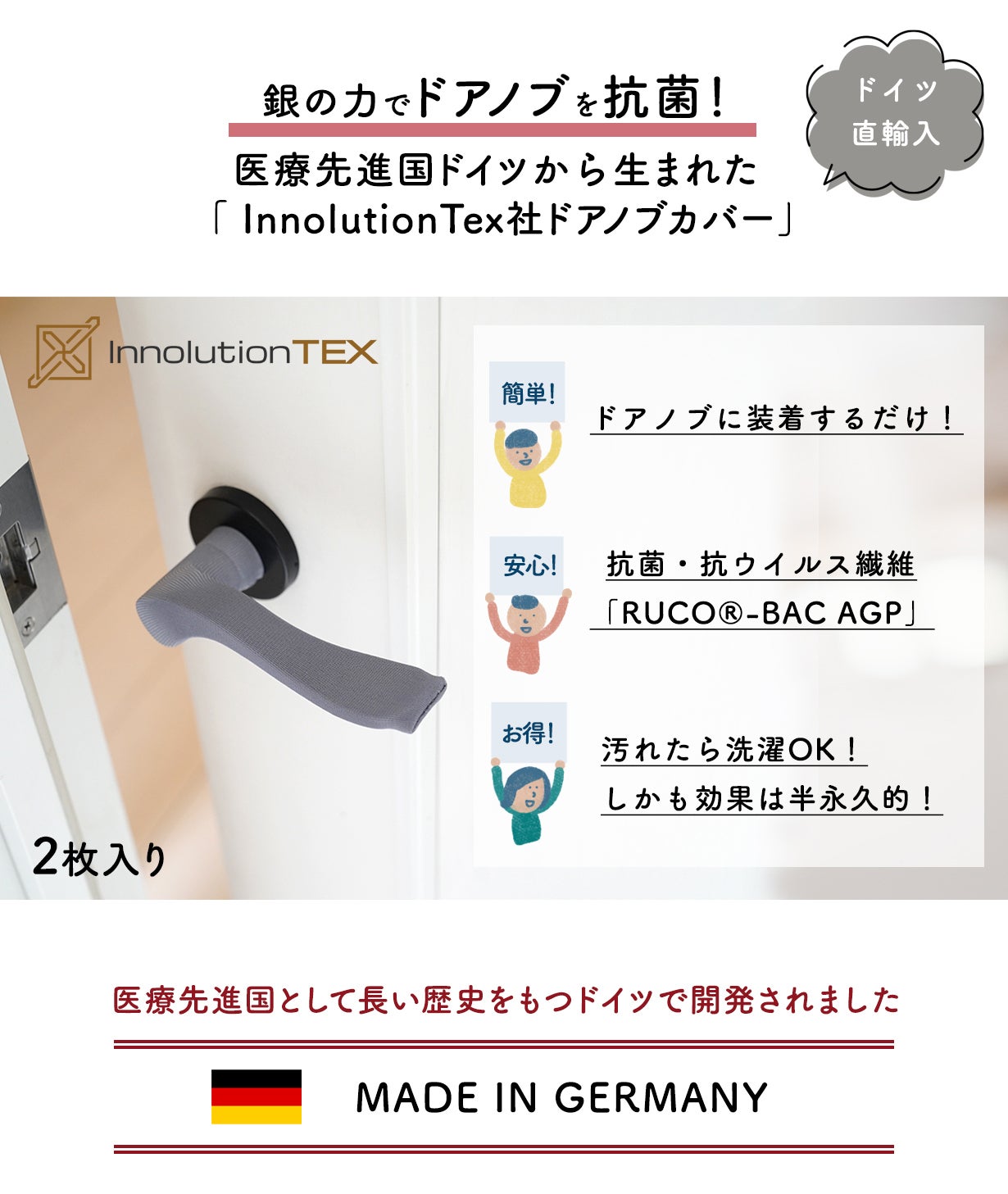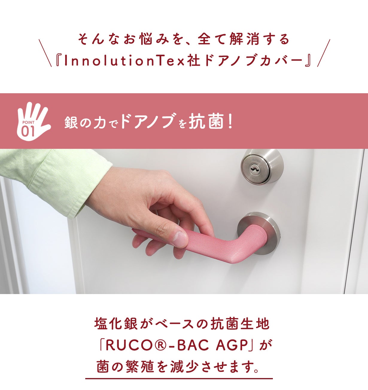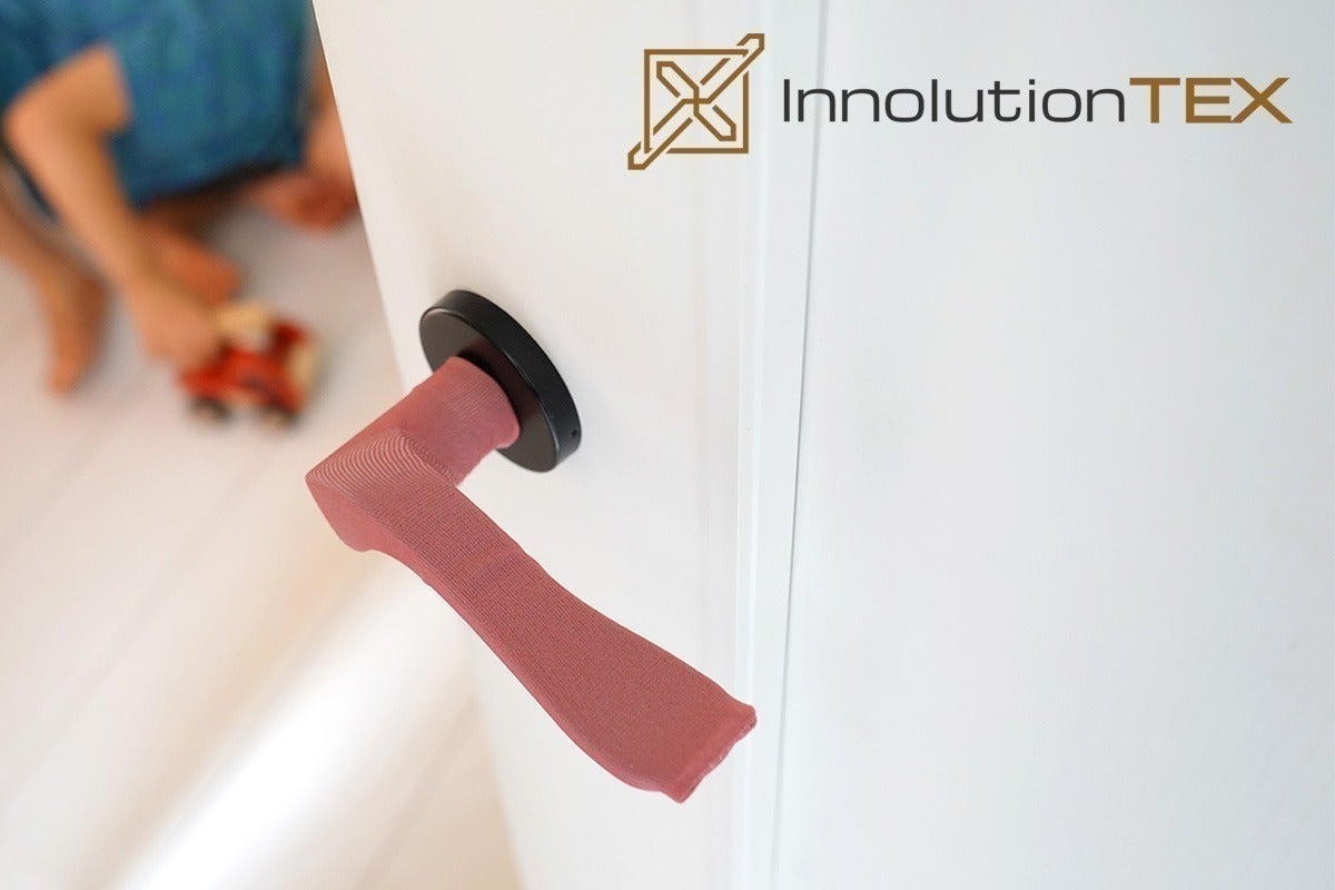 ドイツの生地製品のベンチャー企業InnolutionTexは、だれでも簡単に抗菌できるアイデアを研究し続け、ついに抗菌繊維「RUCO®-BAC AGP」と出会い、ドアノブカバーの開発に成功しました。
