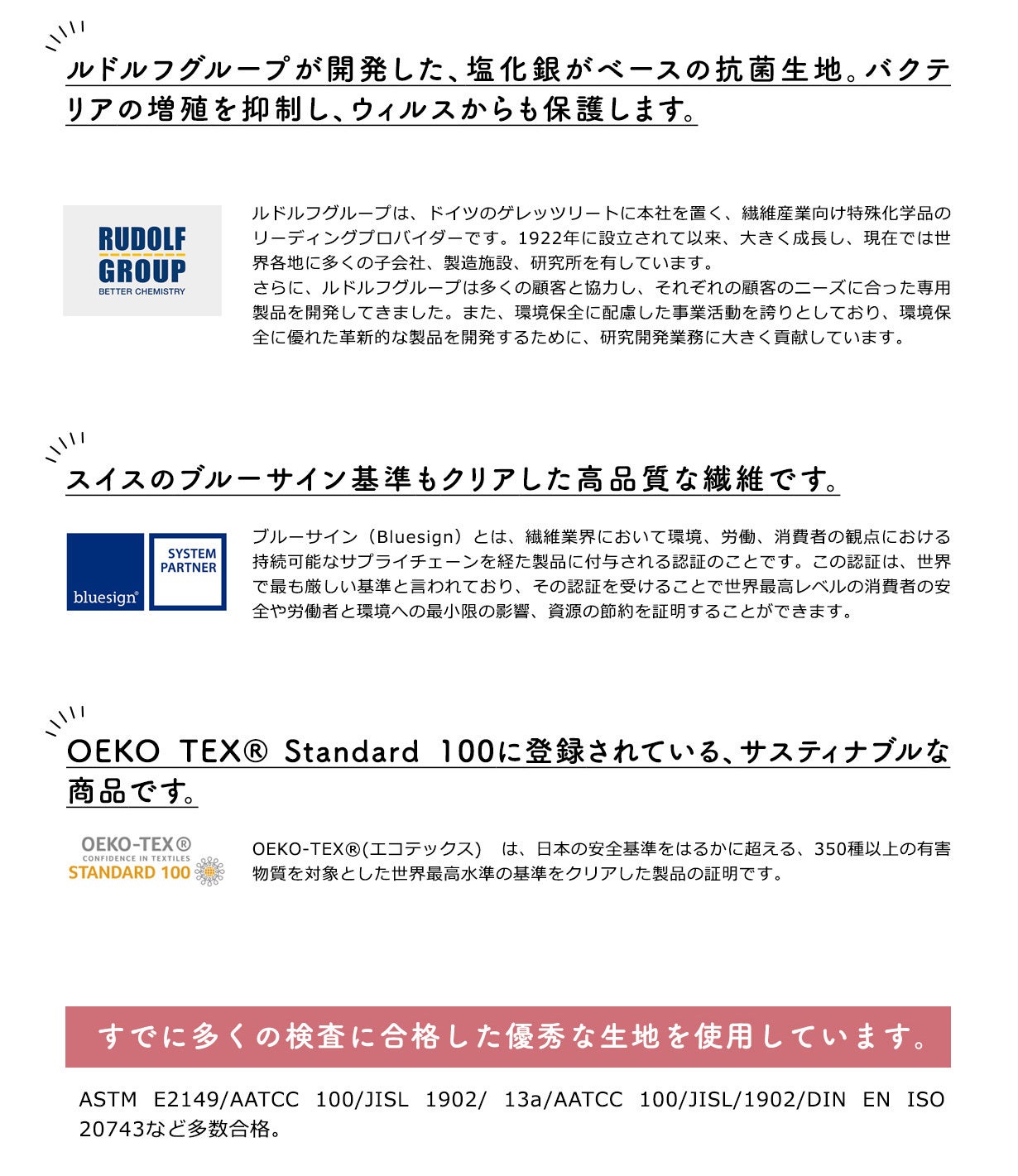 活性物質RUCO®-BAC AGPの抗ウイルス効果は、ISO 18184:2019による試験で確認され、抗菌効果はASTM-E2149-13a、AATCC 100、JISL 1902およびDIN EN ISO 20743による試験で確認されています。
