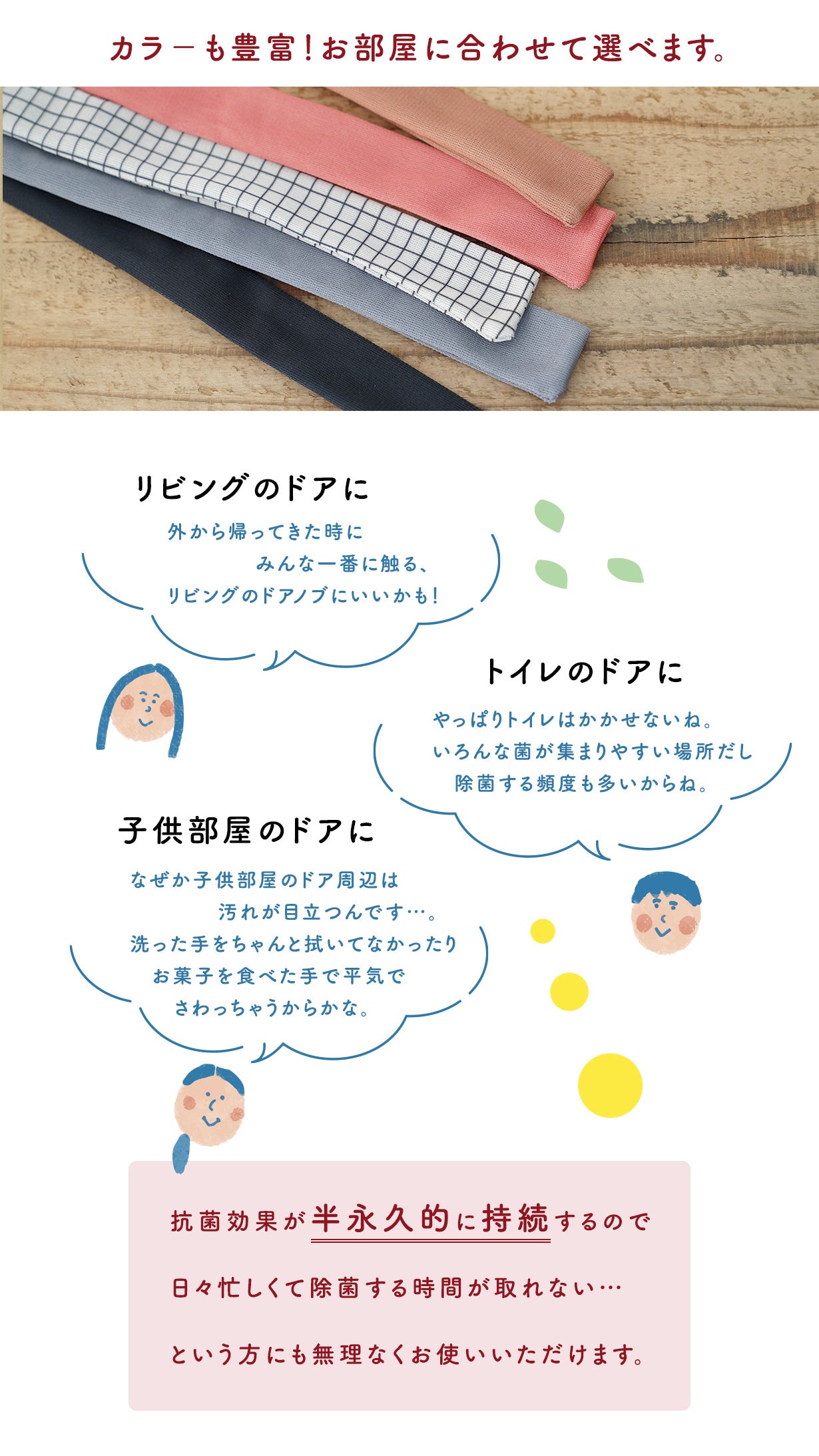 ドアノブに装着するだけで半永久的に除菌効果が期待できる便利アイテムとして家事時短のお役に立てればと思っています。