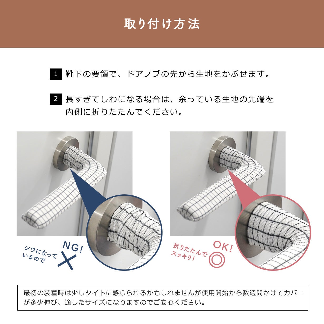 伸縮性のある生地がドアノブの形状にフィットするので、ごわつかず自然にハンドルを握れます。子どもからお年寄りまで快適にご使用いただけます。