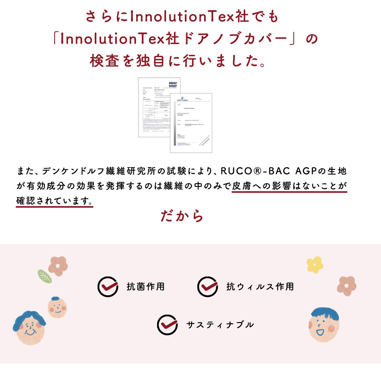 それまでのEU圏での買い付け実績先などから様々な情報収集を行った結果、医療先進国ドイツのInnolutionTex社がドイツで特許を取得したRUCO?-BAC AGP抗菌繊維を使ったドアノブカバーに出会い、知れば知るほど、使えば使うほどこの製品の効果、手軽さはママたちの味方になると確信しました。交渉の結果、日本で初めて正規代理店として契約し日本の市場に紹介できることになり興奮しています。