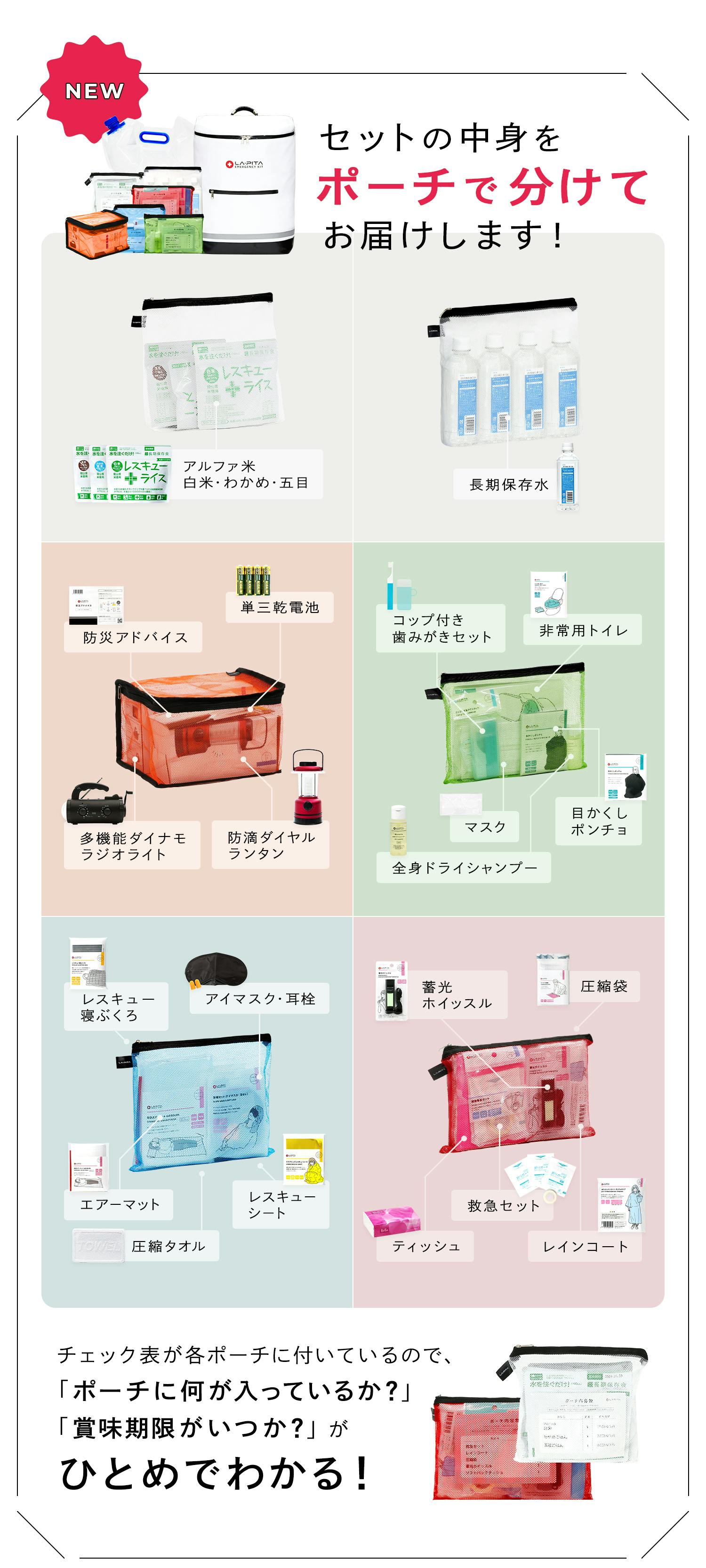 ※ 防災セットのセット内容は、商品パッケージデザインリニューアルのタイミング、商品の入荷状況によって商品パッケージが異なる場合や品質が同等の商品で代替対応させていただく場合がございます。予めご了承ください。