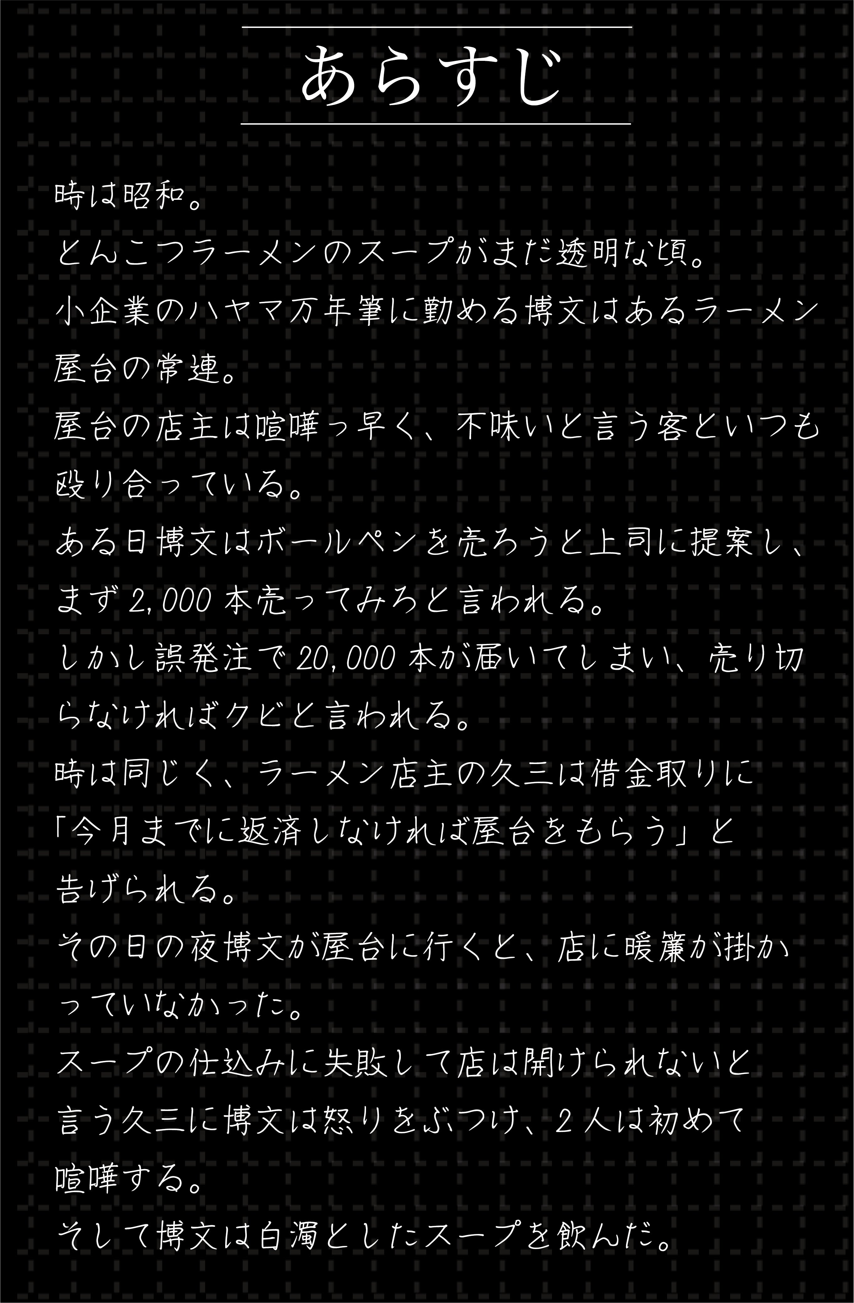 この映画は、ただのラーメン物語ではなく、「一杯のとんこつラーメンが持つ深い歴史」と、「それを支えてきた人々の情熱」を描き、そのストーリーは、観る者の胸に、熱い想いを込み上げさせ、一杯のラーメンに込められた「情緒と情熱」を感じさせます。