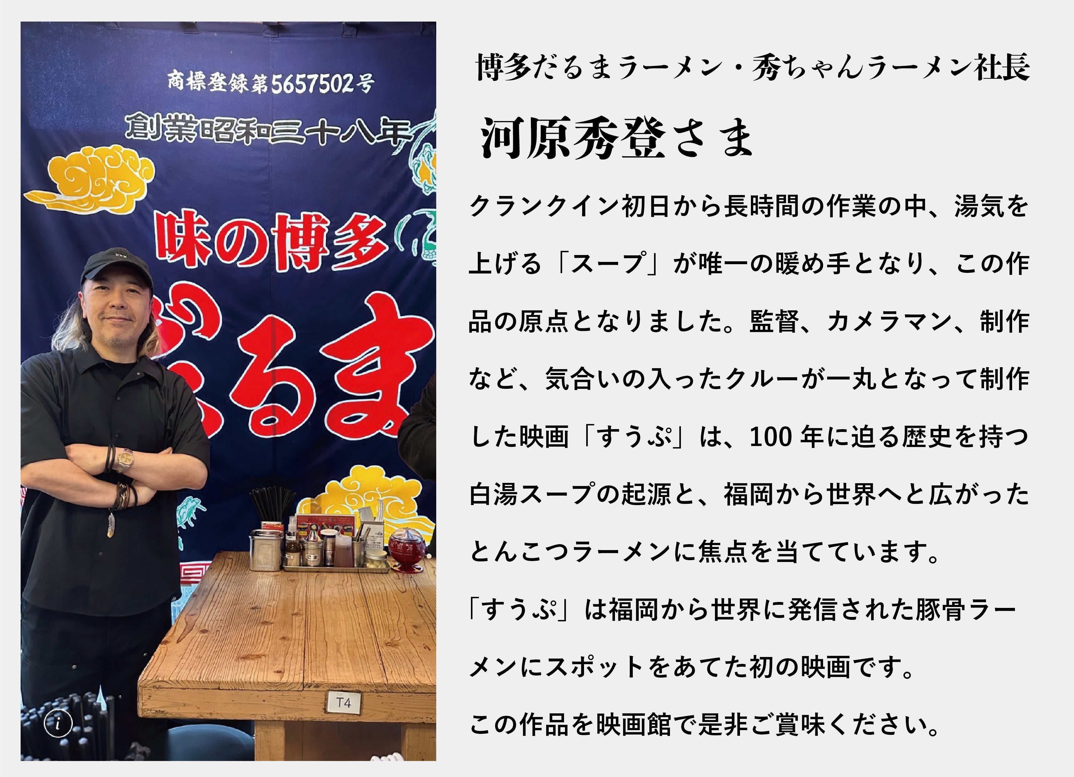 福岡という豊かな土地から生まれ育った私にとって、とんこつラーメンはただの食べ物ではなく、感情や記憶が詰まったソウルフードです。そのとんこつラーメンが今や世界中に広がり、新たなブームを巻き起こしているという事実は、感動と誇りで胸がいっぱいです。その深い愛情を形にするべく、人生を賭けてとんこつラーメンに焦点を当てた映画の製作に挑みました。そして、福岡の土地で才気あふれる若いクリエイター達と共に、私たちの熱意と情熱が詰まった素晴らしい作品が生まれました。私たちの心を込めたこの作品を、ぜひ多くの方々に感じていただければと思います。ご支援のほどよろしくお願い致します。