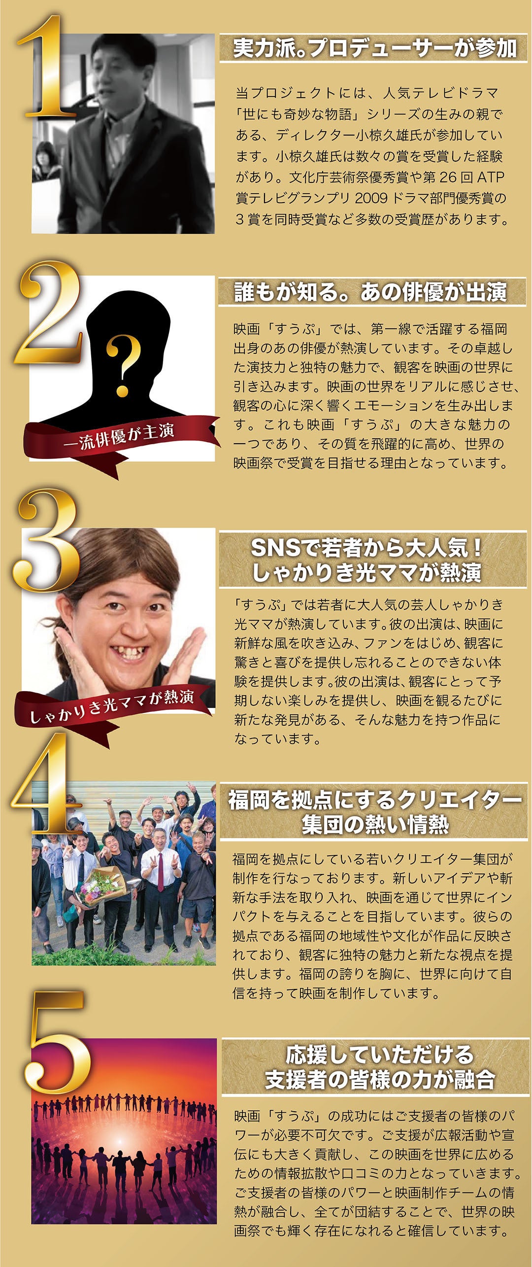 ご支援して頂く映画「すうぷ」が国内外の映画祭で受賞を目指せるのには、5つの理由があります。