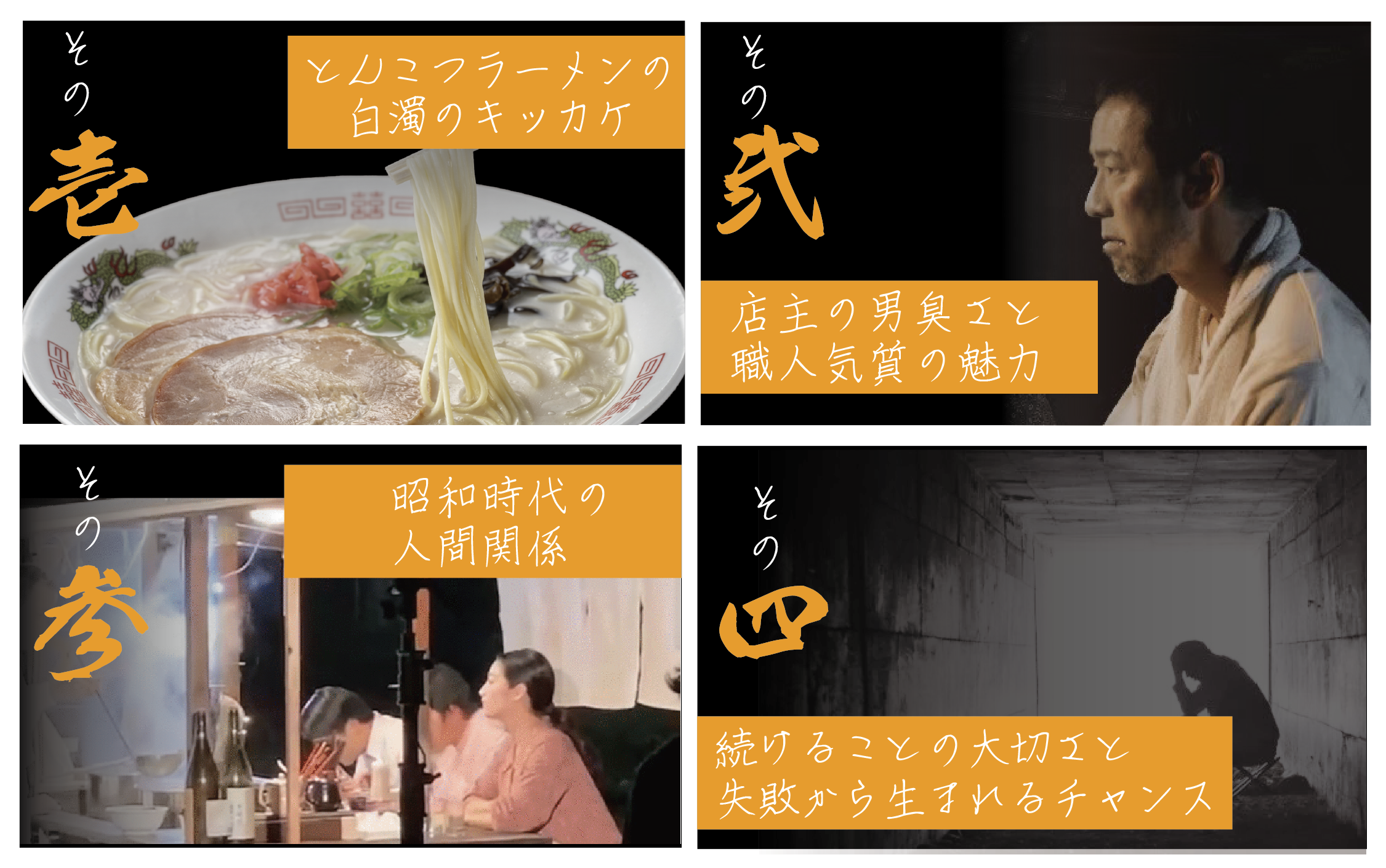 この映画は、【失敗から生まれたとんこつラーメンの誕生秘話】を描いている唯一の作品です。そして、昭和の古き良き日本の情緒を、現代の視点から斬新に描き出し、世界の若い層に響くストーリーになっています。