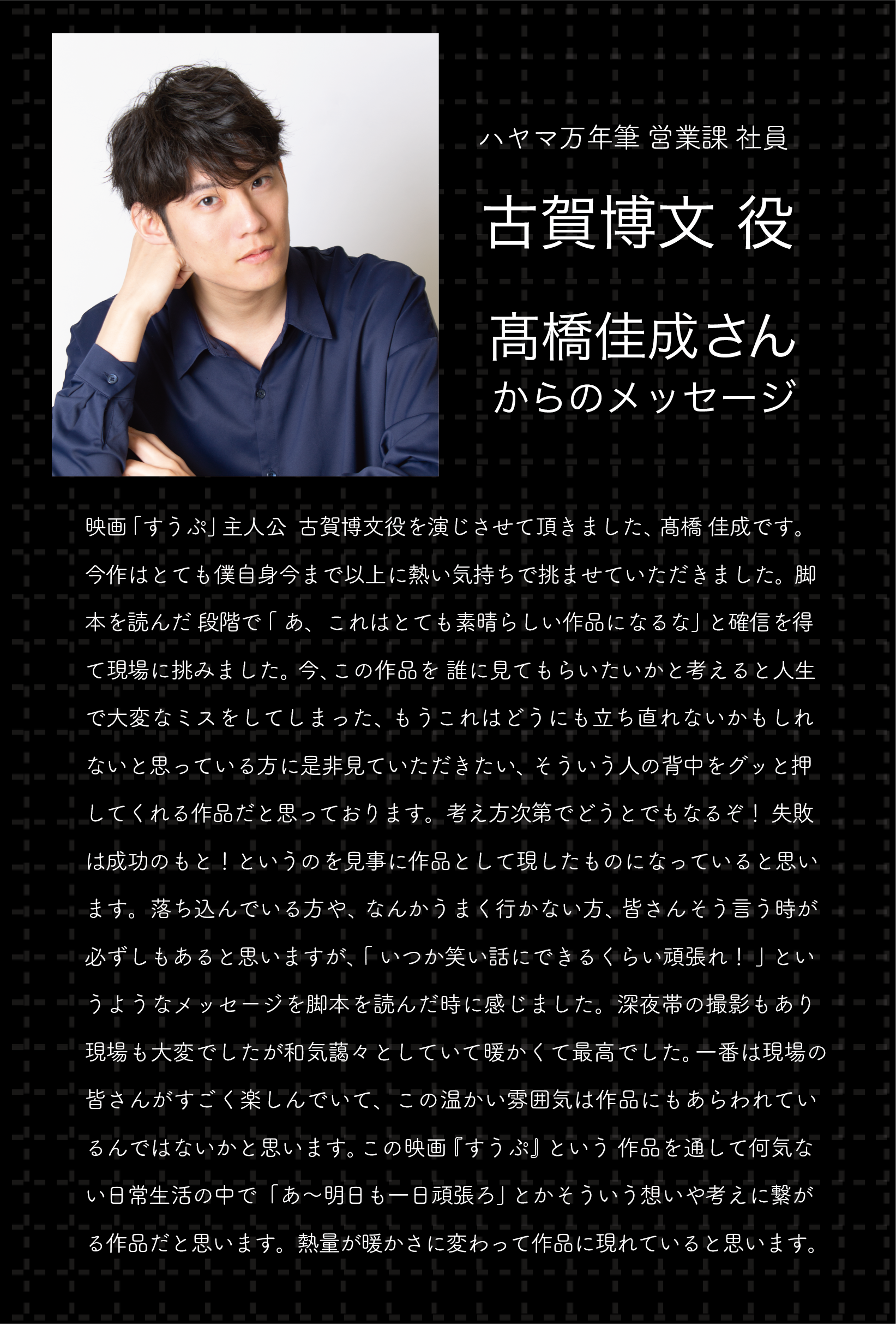映画「すうぷ」は一流のプロデューサー「小椋久雄氏」をはじめ、「実力派の俳優陣や若者にバズっているひかるママなど、豪華メンバーを迎え」心に残るストーリーをお届けします。