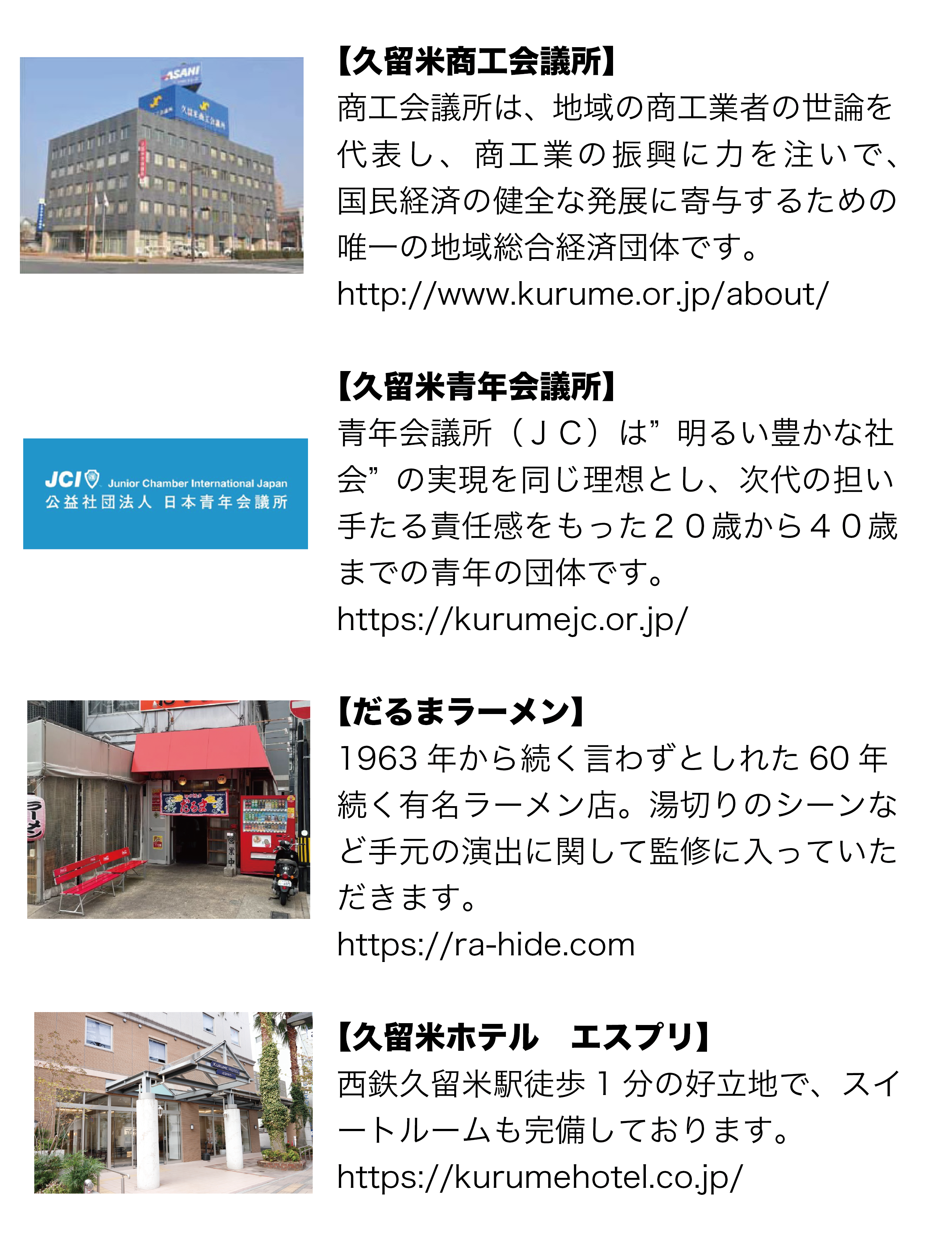ご支援者の皆様には、この映画「すうぷ」のスポンサーとなって頂き、私たちが描くこの福岡県久留米市の魅力と文化が世界に広がっていく喜びと情熱を共有して頂きたいと思っています。