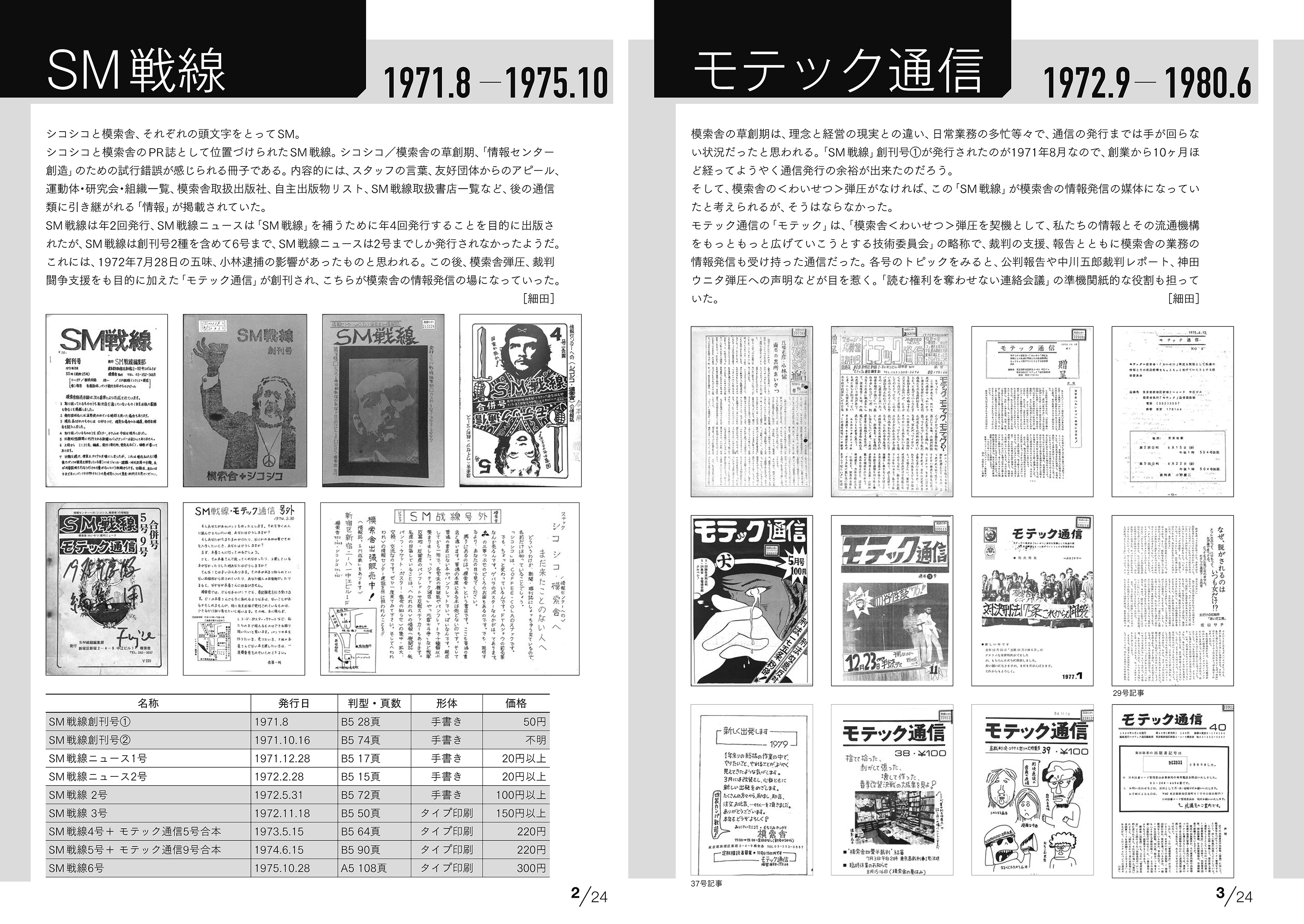 「SM戦線」「モテック通信」「模索舎通信」「模索舎月報」「模索舎月報〈フリーペーパー版〉」の定期刊行物、その他パンフレットなどで、1万数千頁になります。