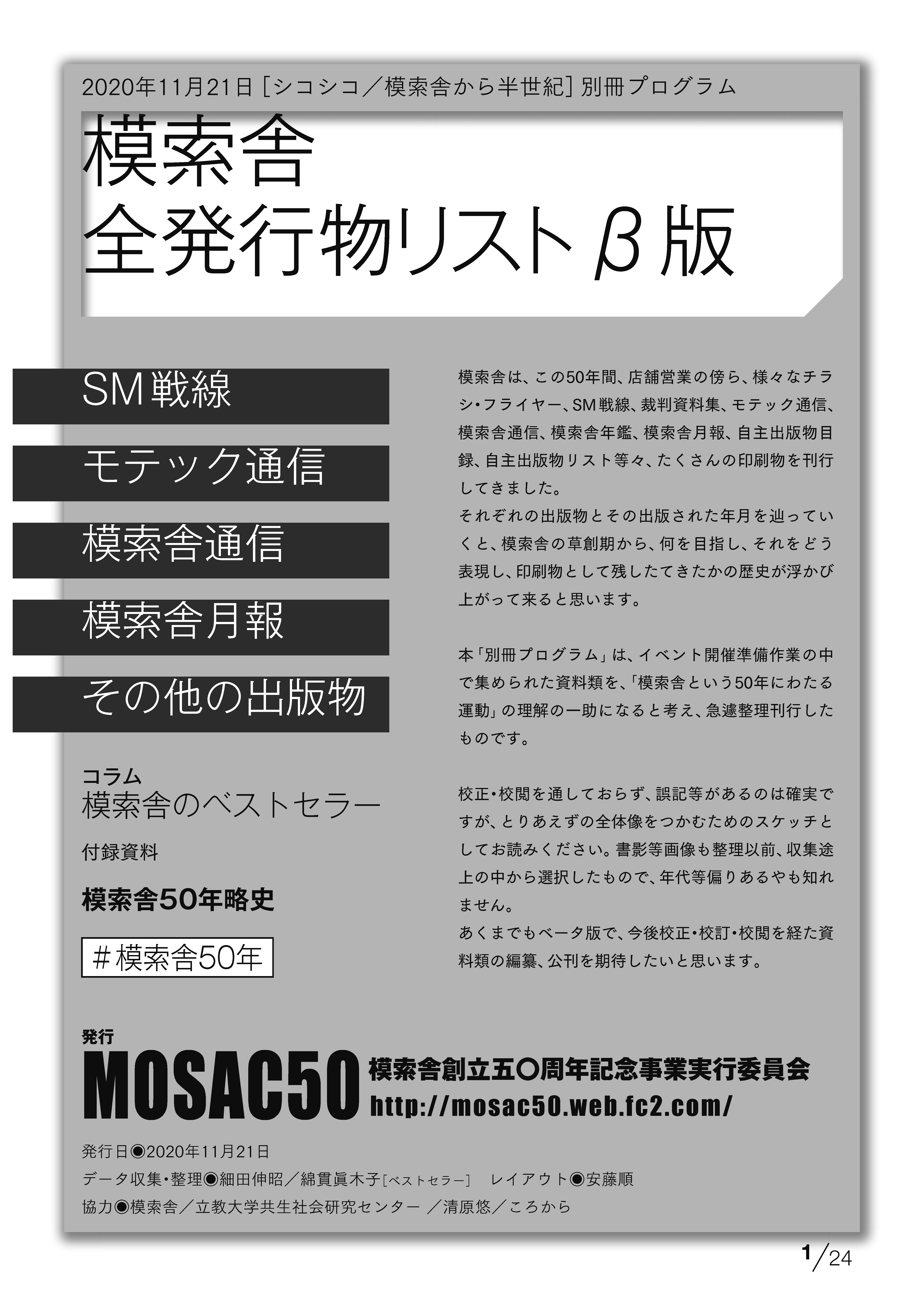 パンフレット「全刊行物リスト β版」(A4・24ページ/非売品)。模索舎の全刊行物をリスト化している。
