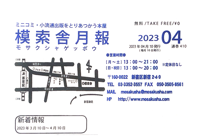 『模索舎月報〈フリーペーパー版〉』通巻410号(2023年4月10日発行)。2010年よりリソグラフ印刷によるフリーペーパー版として現在まで継続的に発行している。