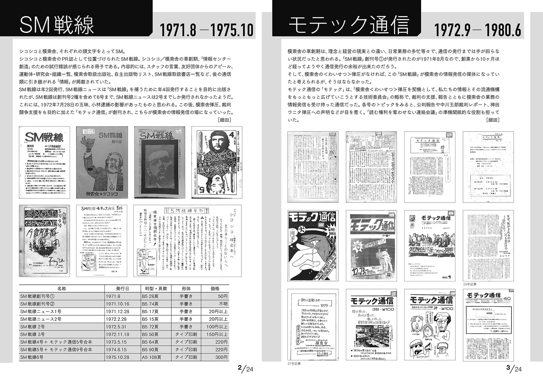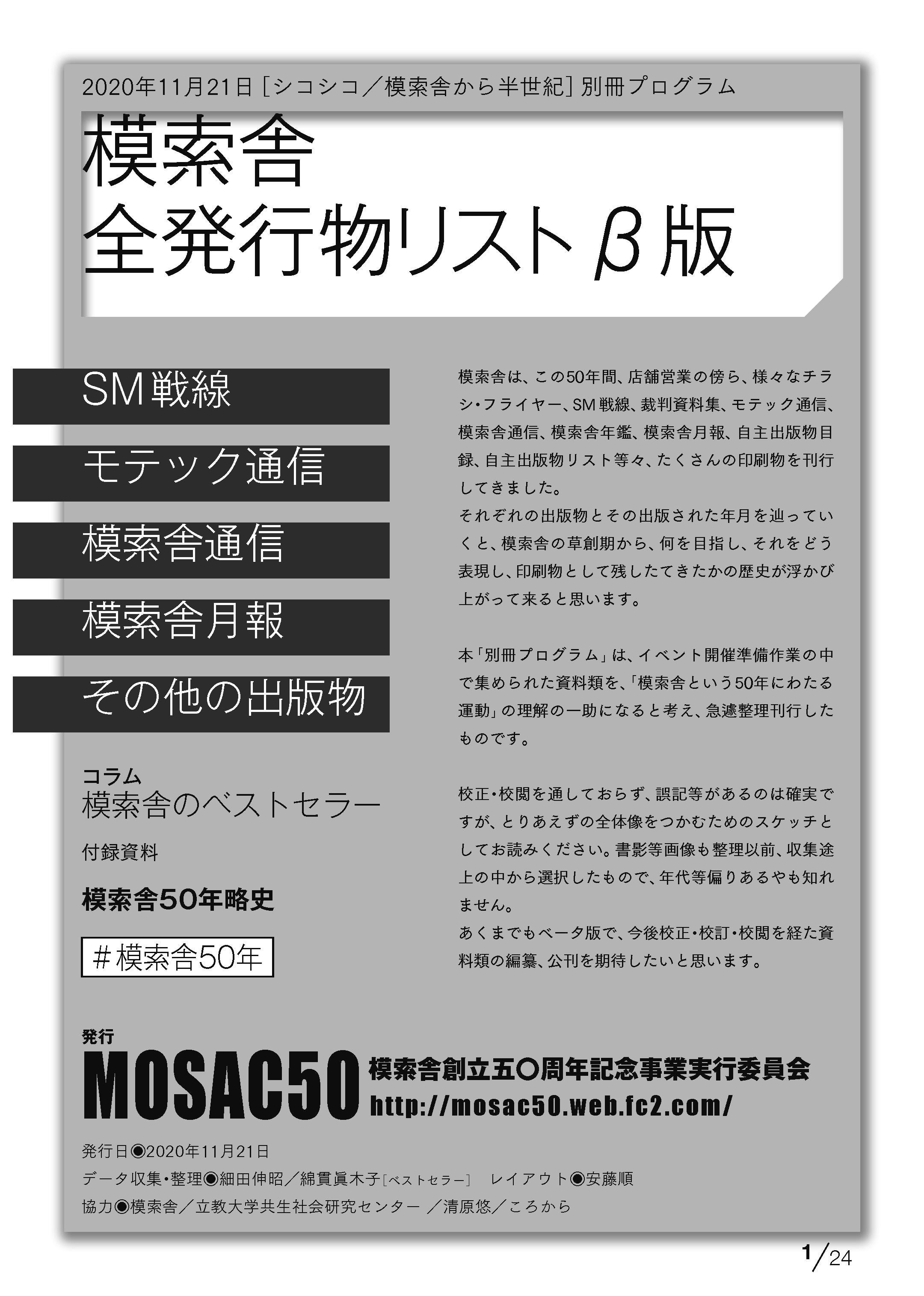 模索舎がこの発行してきた定期刊行物や、パンフレット類をリスト化したA4判・24頁のパンフレットです。非売品の貴重なこの小冊子、ぜひこの機会に入手ください!