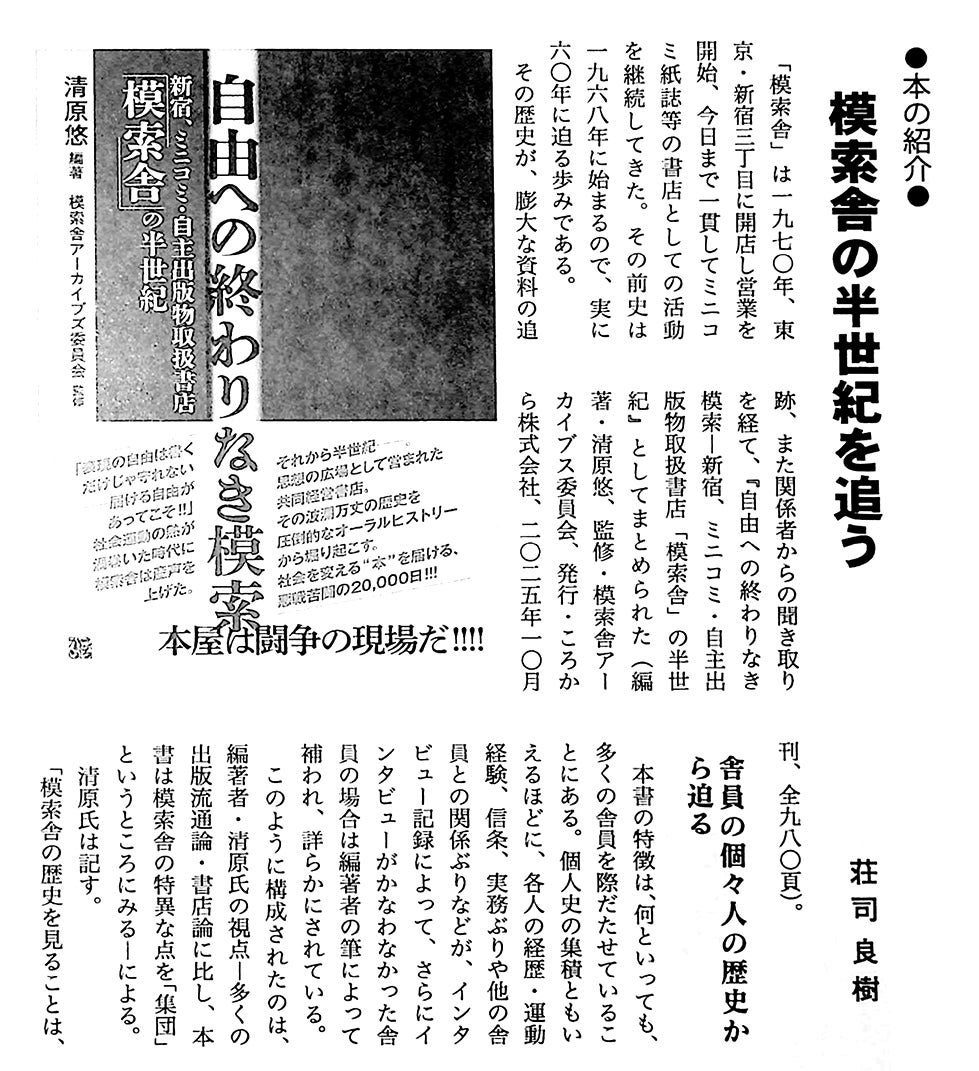 「本の紹介 模索舎の半世紀を追う」荘司良樹