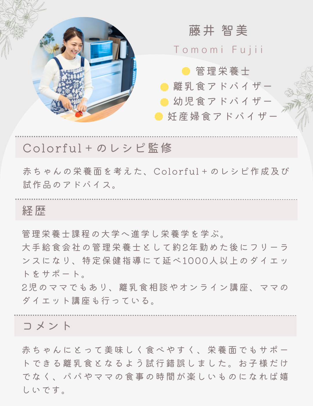 Colorful+のレシピを作成する上で、栄養の専門家でもある管理栄養士の方に監修に入ってもらっています。離乳食の知識も豊富で、ペーストやおかゆのレシピはもちろん、アレンジレシピの作成も管理栄養士が行なっています。