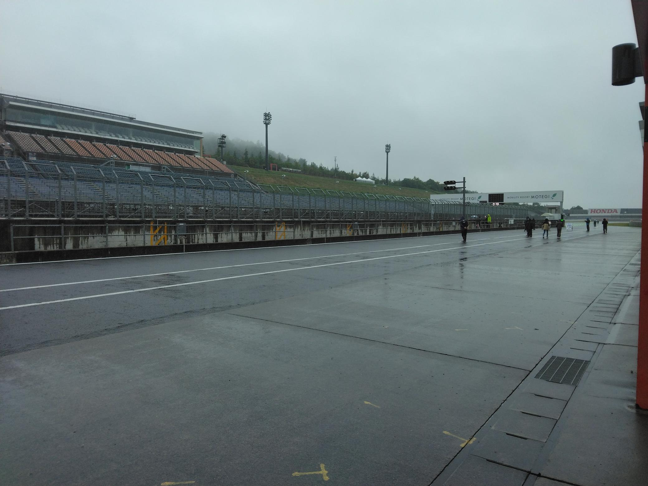 フリー走行を終えました。雨滴とスクリーンの曇りにより前方の視界が悪く、前が見えない中での走行でした。このため、雨が続く場合はスクリーンを取る判断をし、午後の決勝に臨みます。決勝レースは30分遅れの14:55スタートになりました。