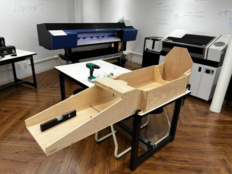 そこで、私たちは二酸化炭素を排出しない電気自動車はSDGsに寄与し、Ene-1はその技術研鑽の場であると考え、エコの観点から、マシンフレームには木材を用いることにし、サステナブルなマシンづくりを行うことにしました。マシンフレームは安価かつ強度の高い積層構造のラワン合板を使用し、ねじりの力に強くなるよう留意して設計しました。マシンの製作は2022 SUZUKA Challengeの準備で使ったところと同じく、「STEAMコモンズ」で行いました。