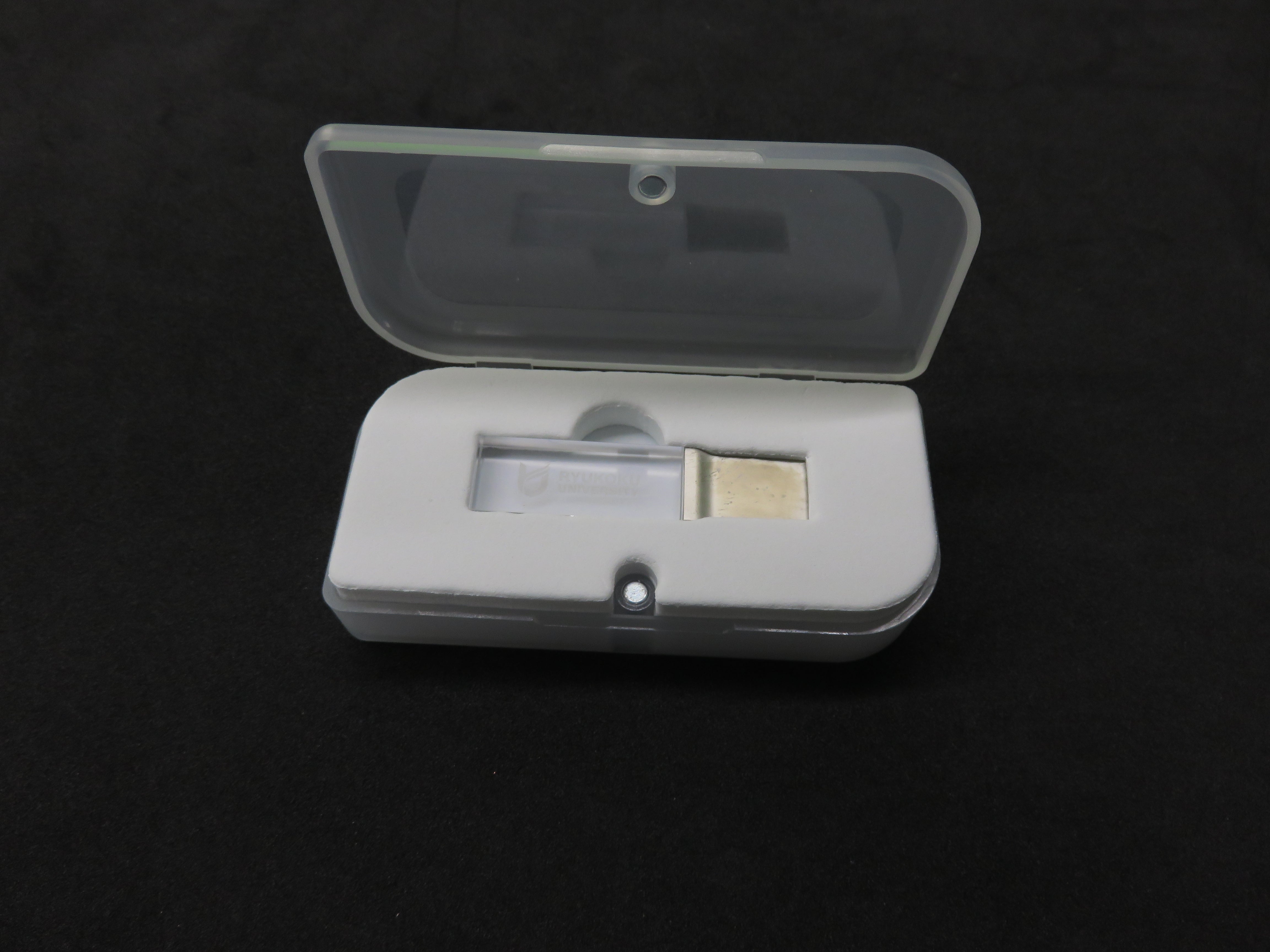 レーザーで龍谷大学のロゴが刻印されたスタイリッシュなクリスタルデザインのUSBメモリです。