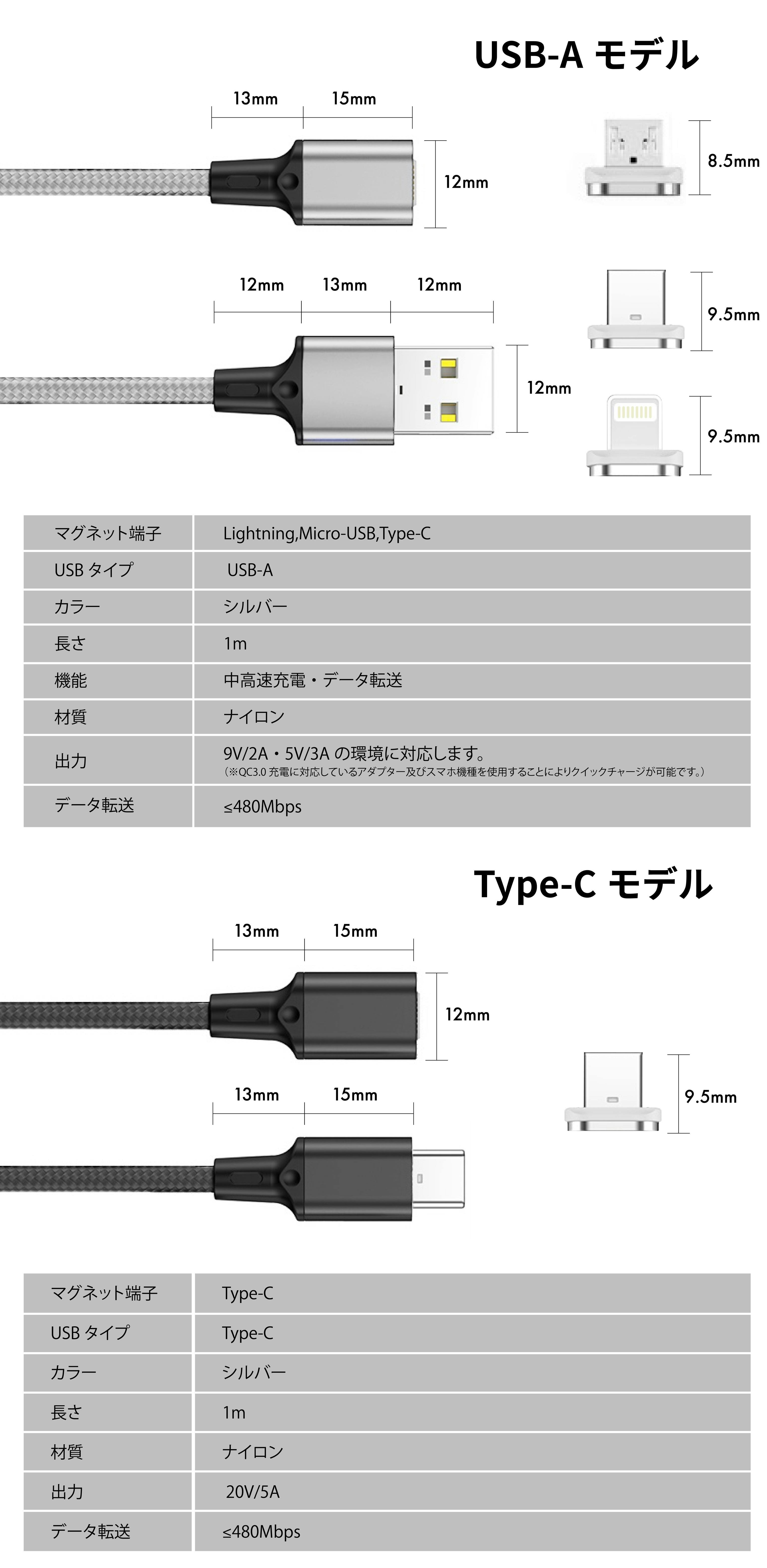 Lightning、Micro-USB、Type-Cのマグネット端子でご使用のあらゆる端末の充電を可能に。