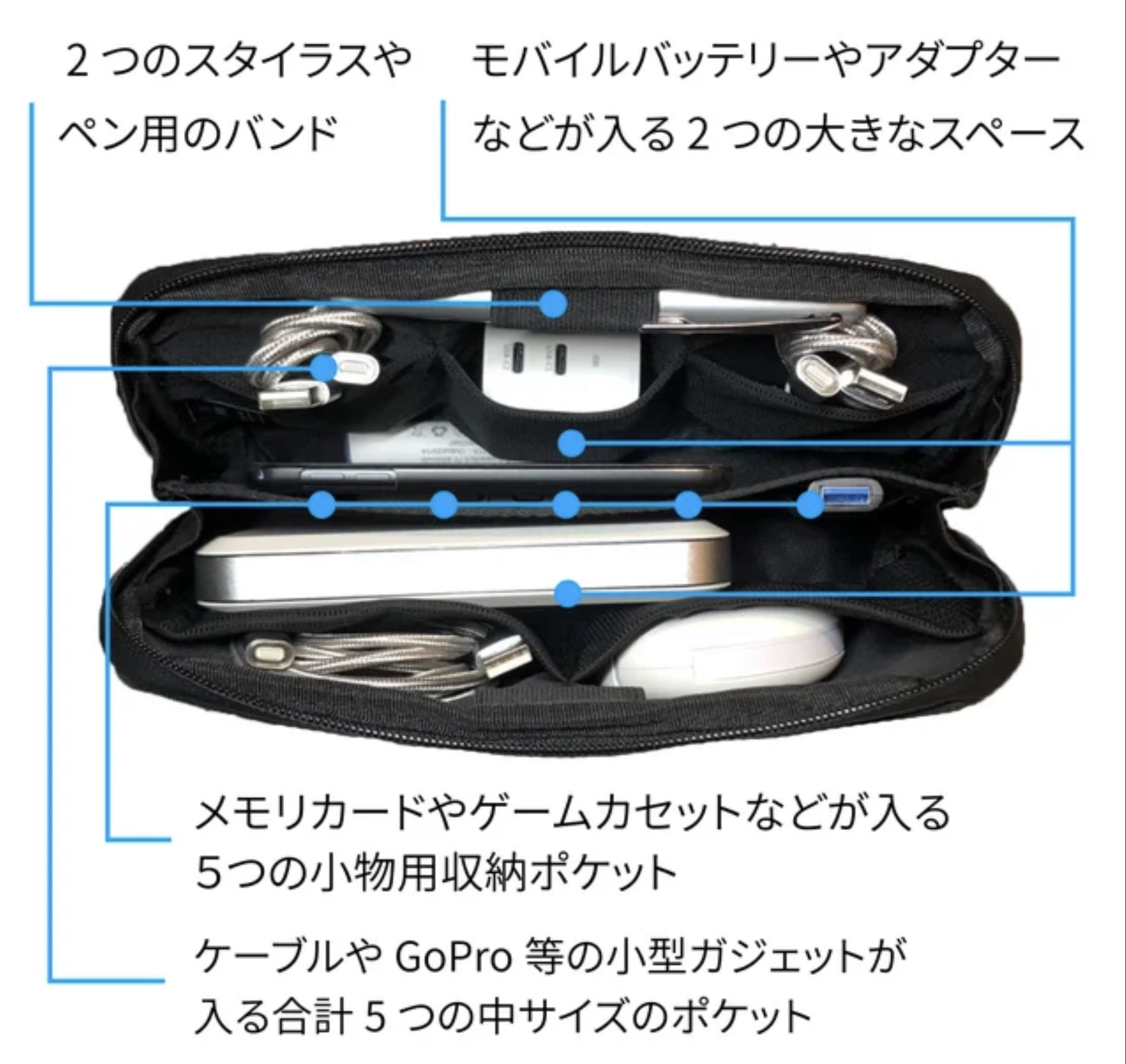 巻取ケーブルには3端子専用のポケットを搭載。いざというときの充電にも対応できます。(※商品本体へ端子は付属しておりません)