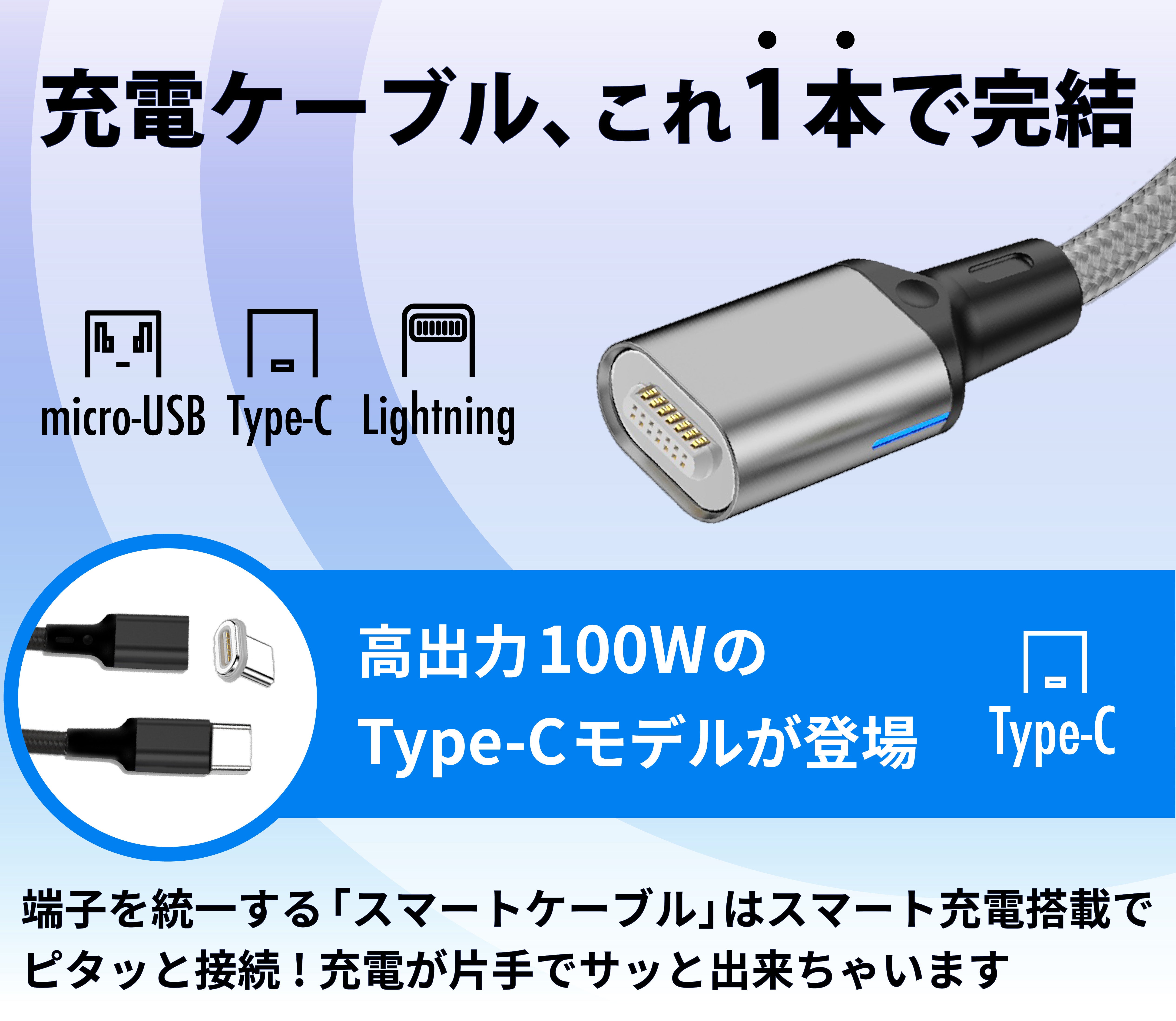 マグネット充電は、規格の異なる端子とケーブルを分割させることにより、ケーブルを統一させることに成功した革新的な充電メソッドです。