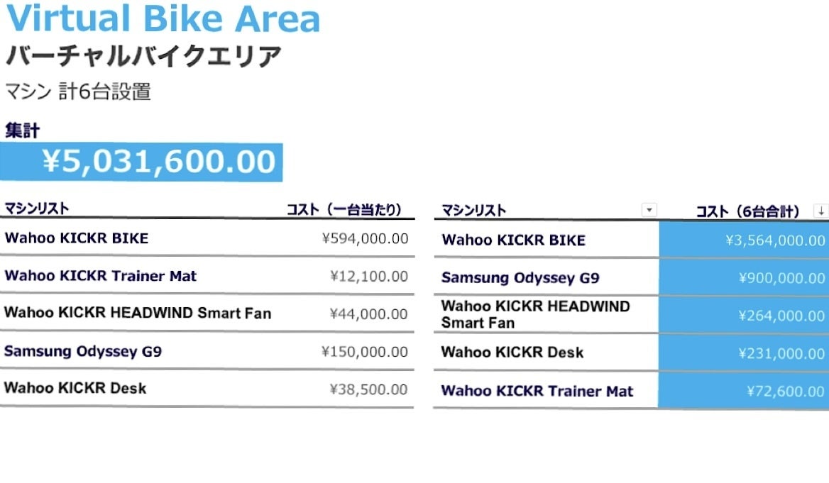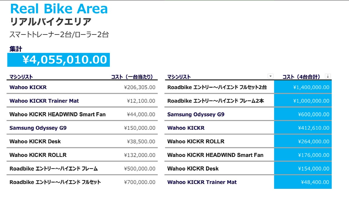 こちらのエリアでは最先端のバイクマシンを導入し、レースさながらの臨場感のあるロードバイクトレーニングを行っていただけます。導入する機材としては主にWahoo社のマシン一式を導入し、Zwift社のトレーニングソフトをモニターに映し出しご利用いただく形になります。より臨場感を出すため、Samsung社のカーブモニターを導入します。
