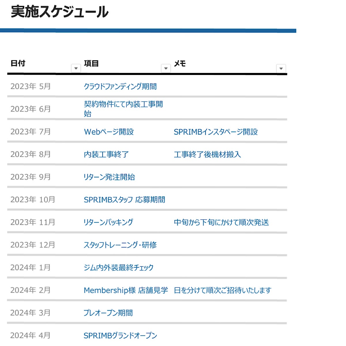 今回、ご支援くださった方のために豊富なリターンをご用意させていただきました。1つ目は【Membership(メンバーシップ)】と称しまして、一般のお客様には会費割引適応を、企業様にはアイテムブースやイベント時のジム貸し出し等のリターンをご用意しております。二つ目のリターンとして、一般の方のメンバーシップにはリターン額により、追加リターンとしてSPRIMBオリジナルアイテムをご用意させていただきましたので、詳しくはリターンページをご確認ください。