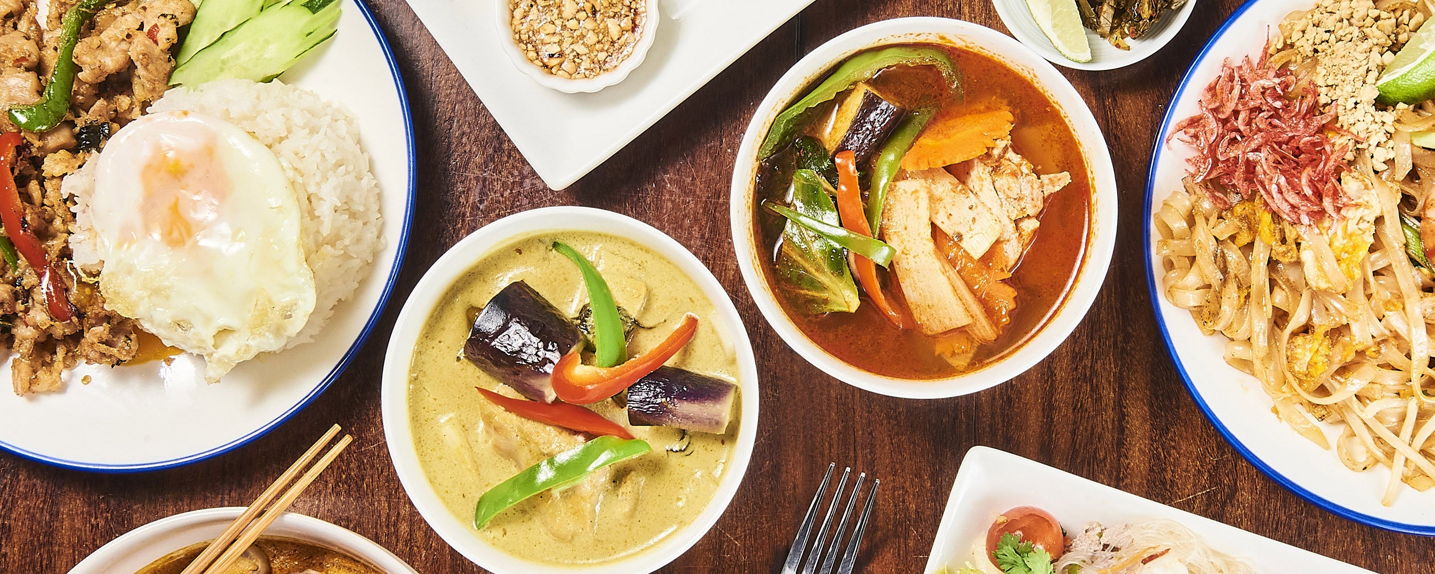 グリーンカレー、マッサマンカレー、ガパオライス肉、カオマンガイ、ガイヤーン(鶏のグリル)、ヤムウンセンセット、パッタイセット、ジャスミンライスレトルト3P