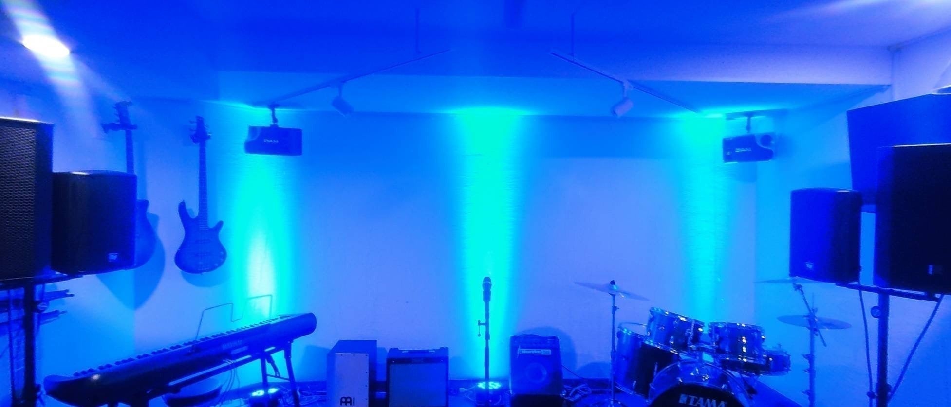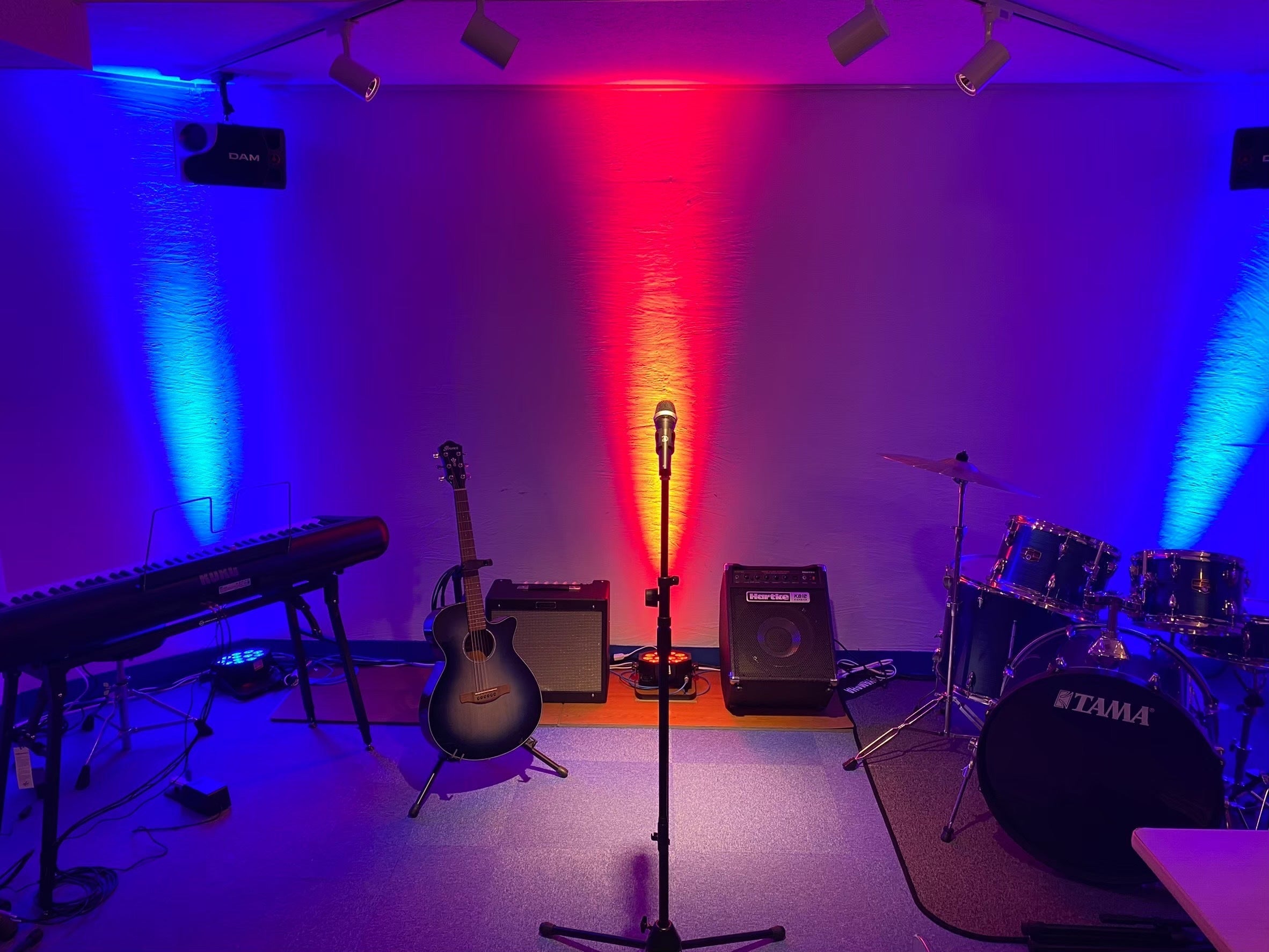 ・常設のギター/ベース/ドラム/キーボードはいつでも演奏可能。楽器を触ったことのない方でも自由に演奏できます。音響/照明機材完備。カラオケも楽しめます。