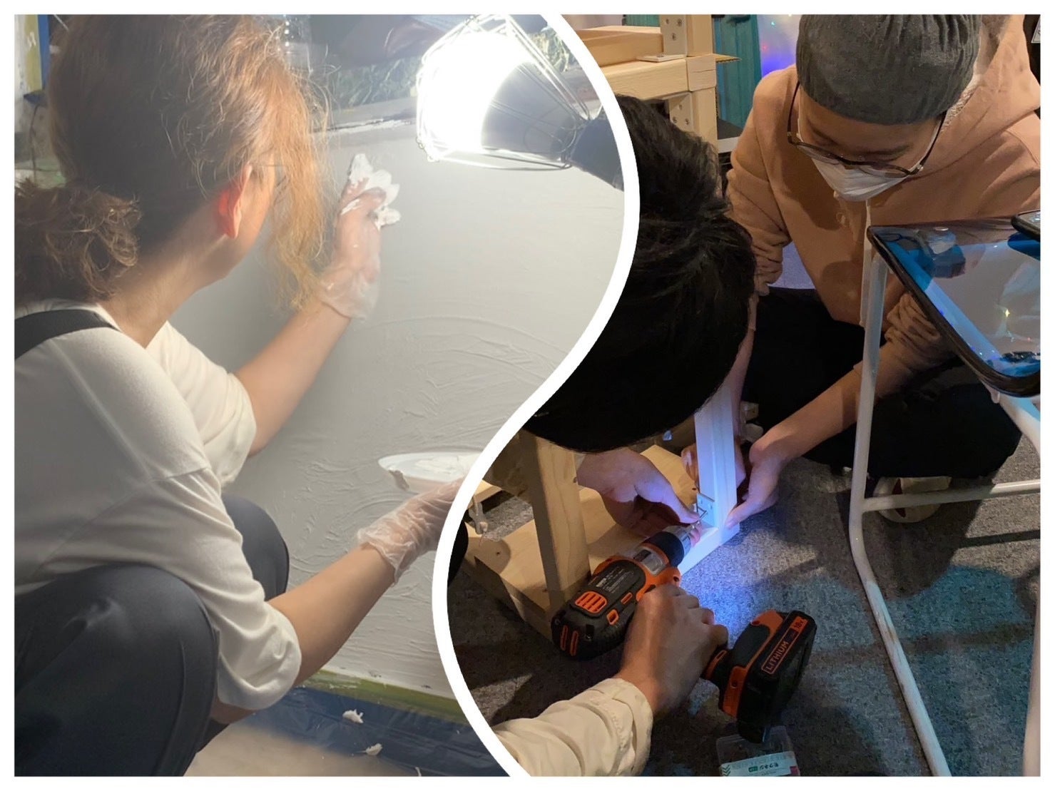左:壁を塗るオーナーあかね 右:店舗のPCラックをDIYする娘夫婦