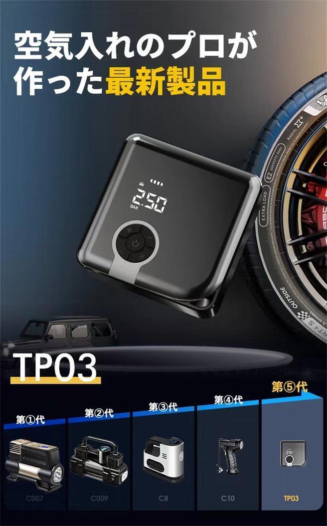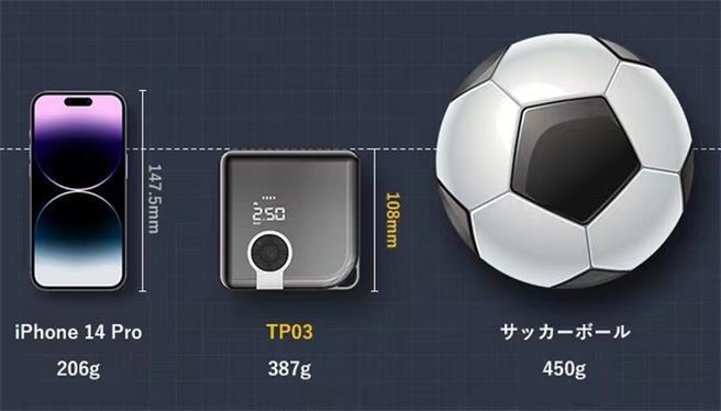 持ち運びや収納をより便利にするため、ポータブル空気入れ「TP03」のサイズは、継続的に改良を図っています。