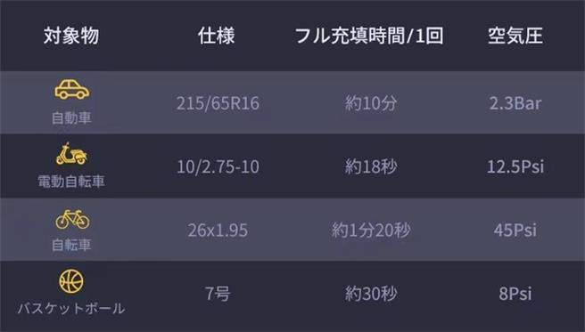 0気圧値から空気フル充填までの時間と空気圧の目安を参照してください。