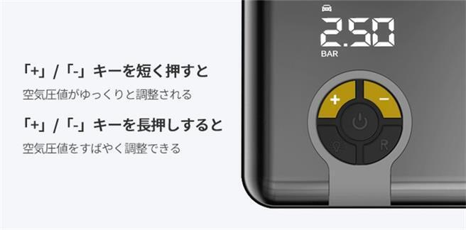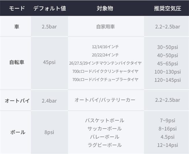 電源を3秒間長押しすると、4つのモード(車、オートバイ、自転車、ボール)と4つの圧力値(Bar、Psi、Kpa、Kg/cm2)から選択できます。