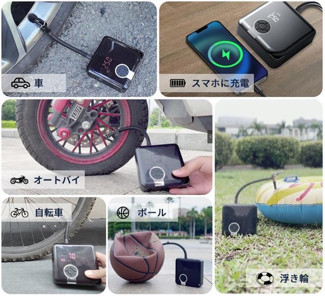 5種類のバルブと4種類のモードで、車、オートバイ、自転車、ボール、プールなどへ空気入れができる。