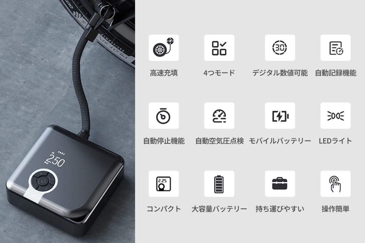 適切な空気圧値を事前に設定することで、ワンクリックで空気入れを行い、空気圧値が設定値に達すると自動的に停止します。空気が過剰に充填され、タイヤがパンクするといった心配はありません。