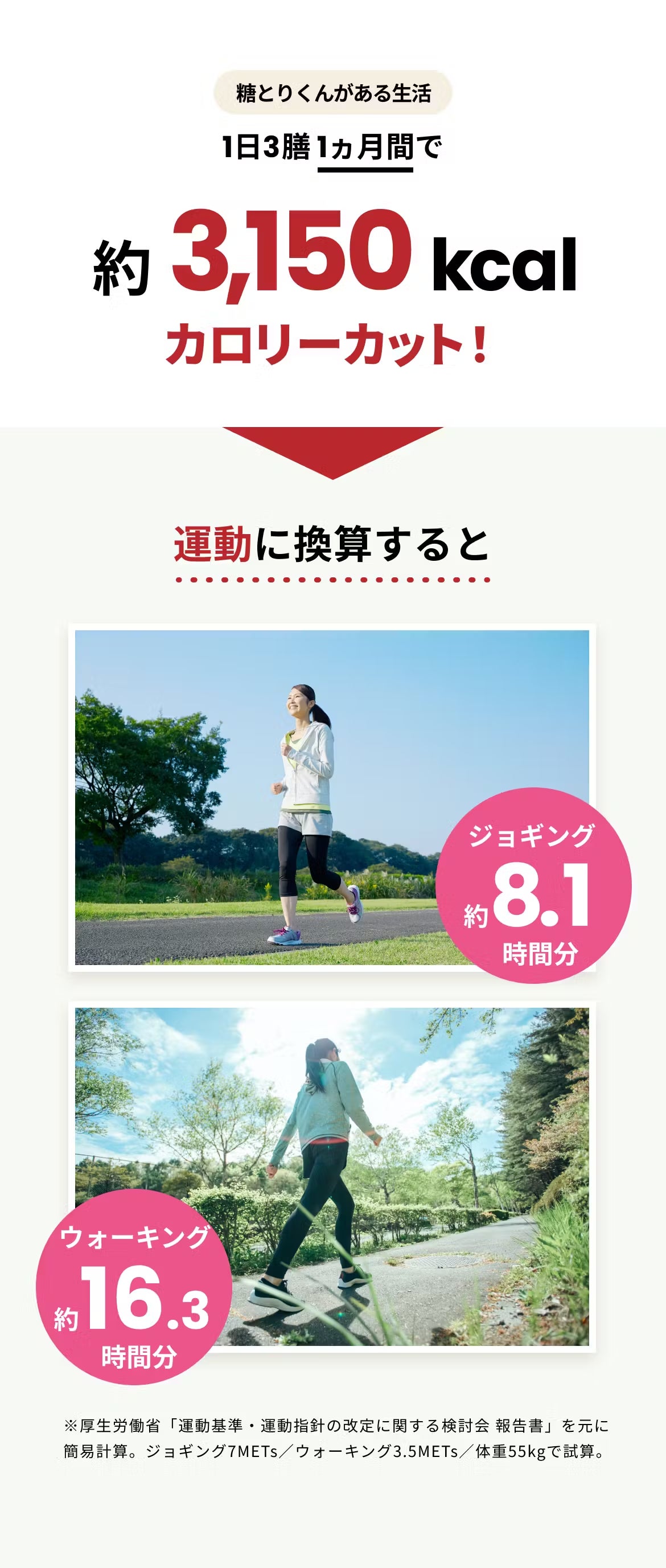 毎日何気なく食べている「ごはん」の糖質量をご存じですか?「ごはん」が糖質制限ダイエットの“ラスボス”という理由はココにあります。糖とりくんを使うと、1ヶ月でこれだけの糖質とカロリーをカットすることができます。 (15%カットで試算)