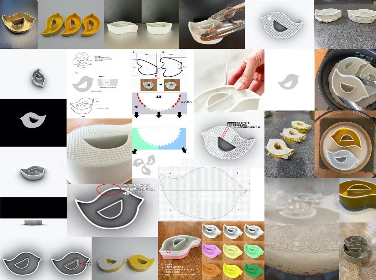 という、炊飯結果以前の致命的な欠陥が判明!ヤマト陶磁器さんとの検証の結果、総重量以前に「全体のウェイトバランス」に問題があることが判明。この製品は「適度に浮いた」状態にすることが重要なのに、沈んでしまっては…。そこで再度全体のウェイトバランスと全体ウェイトを整えるべく、ヤマト陶磁器さんに何度もCADを引き直して頂き、再度試作を試みることに。