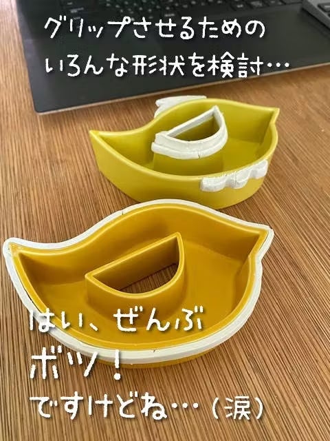 ん~確かに。そこでさまざまな解決方法を検討の結果、底面と側面に「エンボス加工(デコボコ加工)」を施す方向で、再度「第4号試作器」の制作に着手!