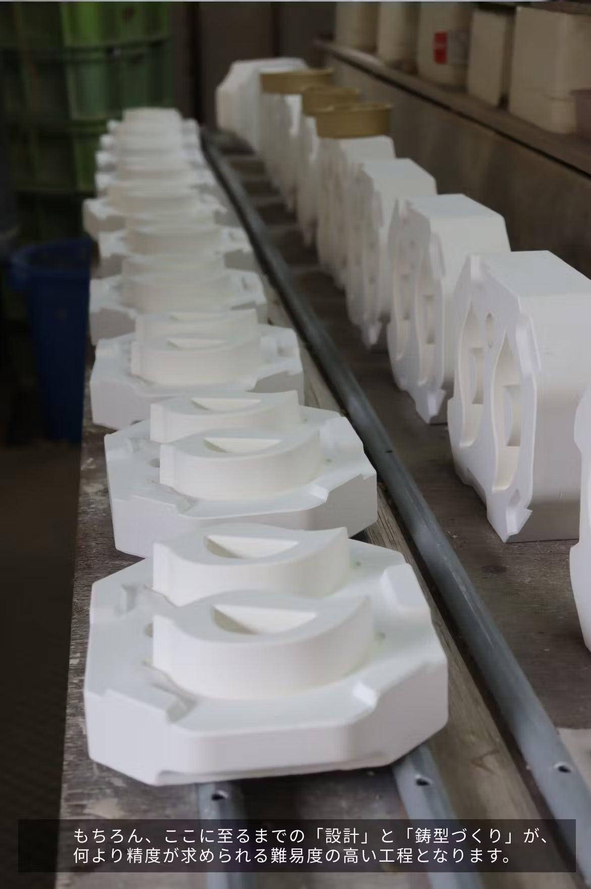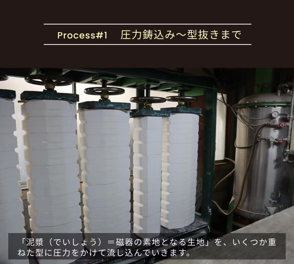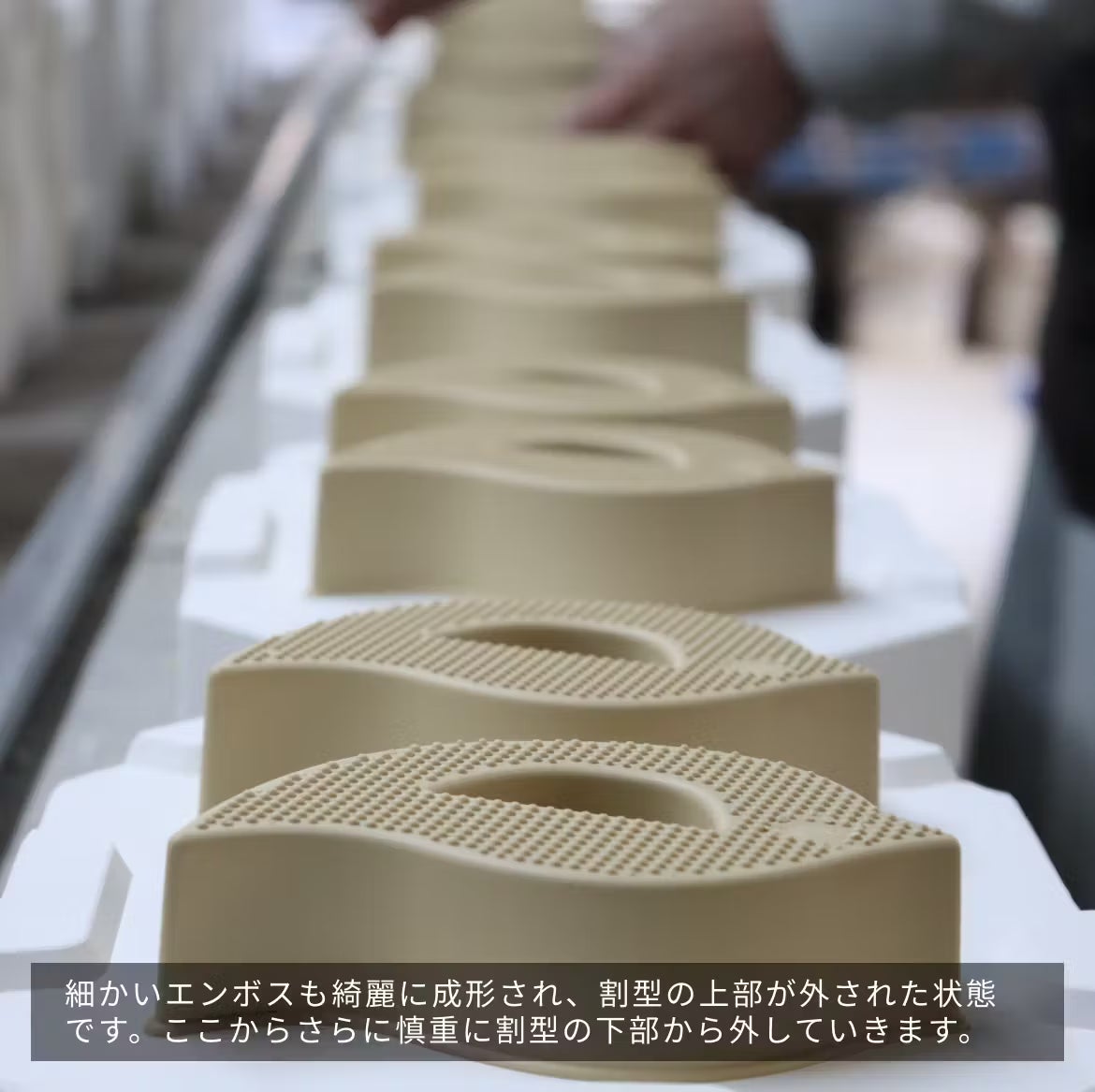 との連絡が。ならば型を4つ割にするか6つ割にするか等々、様々な検討の結果「転写技術を使いましょう」とのヤマト陶磁器さんからの提案。つまり、型の側面にエンボス加工を施すことは難しいが、「転写(側面にエンボスのシールのようなものを貼る加工)」ならイケるかも?とのことで、その方向でGo!そして最終試作品へ。