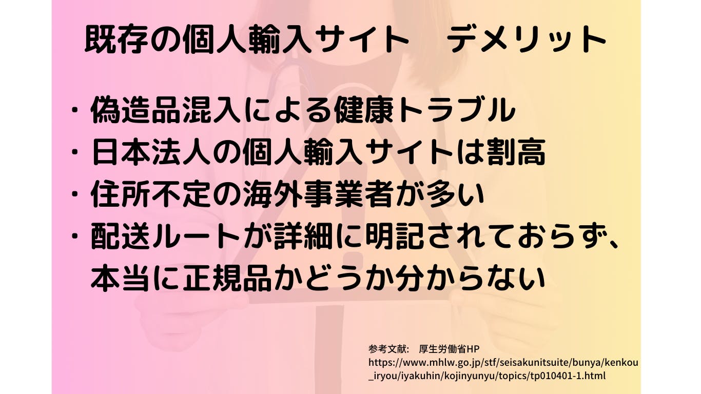 また冒頭でも述べた通り、個人輸入サイトの運営は海外事業者が多く、住所が不定であったり、カスタマーサポートが繋がらないなど利用者にとって不安要素がとても多いのが現状です。