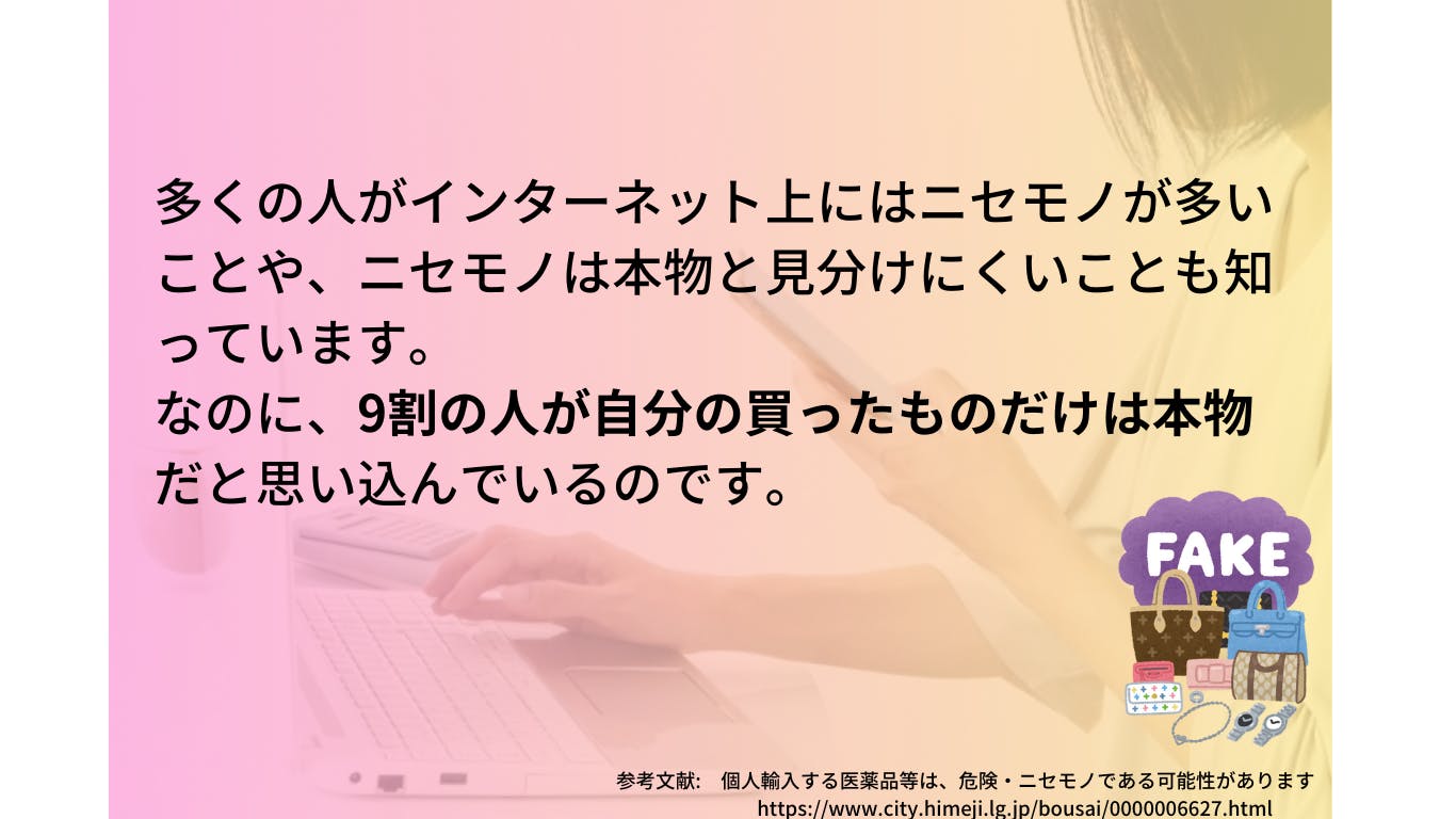 私は約1年前から頻繁に個人輸入サイトを利用していますが、最近では偽造品の問題や健康被害など、個人輸入サイトによるトラブルが相次いでいます。厚生労働省や地方自治体などが注意喚起を行っている状況ですが、このような状況の中で、私が普段利用する個人輸入サイトから届く商品が本物か不安に思うようになりました。そこで、インターネットやメディアを通じて個人輸入サイトの実態を調査し始めました。その結果、住所不明の海外事業者が個人輸入サイトを運営していたり、注文した商品とは異なる国から商品が届くなど、いくつか不可解な点を発見しました。だからといって、それらの個人輸入サイトが違法行為をしていたり悪徳業者だと断定することはできません。