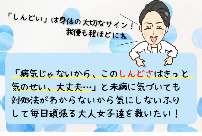 しかしながら、40歳ぐらいになるとどんどん「なんかしんどい…」が増えていき、朝起きた時から吐き気がするぐらいの慢性疲労があって、頭痛もするし、なんか便秘だし、冷えるし。肌もくすんでくるし、肩こりでギューってなったりするし、イライラするから人に嫌なこと言ってみたりもするし(笑)