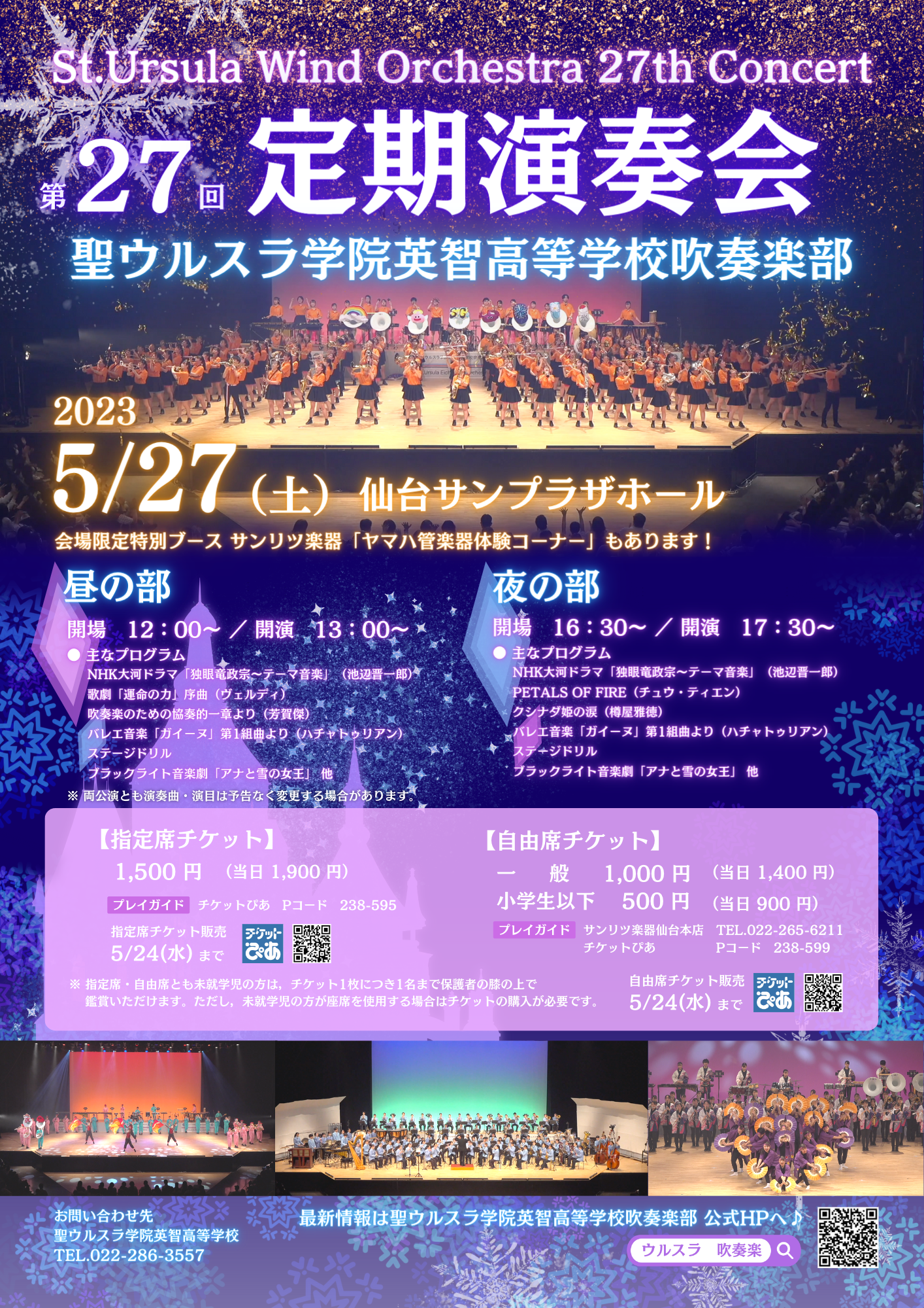 聖ウルスラ学院英智高等学校吹奏楽部では,2023年5月27日(土)に第27回定期演奏会を開催することになりました。昼の部,夜の部の2回公演を仙台サンプラザホールで予定しております。
