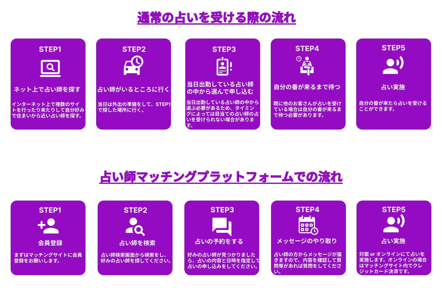 占いを受ける場合は、 通常であれば下記の流れ(STEP① 〜 STEP④)になるかと思いますが、具体的な課題とITプラットフォームによる解決を記載しております。(要所要所でITプラットフォームのデザインも添付しております。)