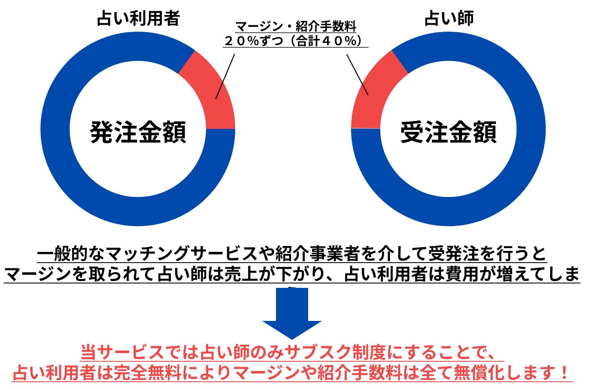 今回のプロジェクトでは、マージン・紹介手数料を取らずに上記のデメリットや制約はなるべく少なくしつつも、占い利用者は全国の占い師から比較検討ができたり、たくさんの占い師から条件を絞り込んで検索し、オンライン/オフラインで占いを受ける機能などの利便性はきちんと有しているマッチングプラットフォームを構築します。