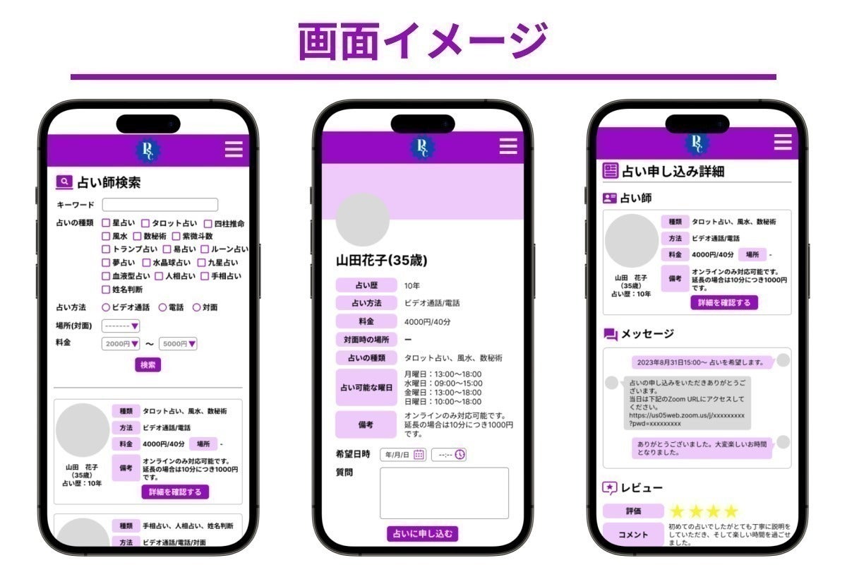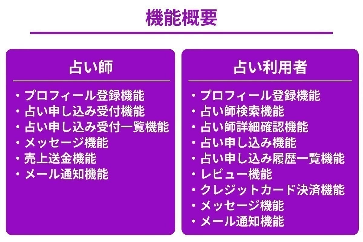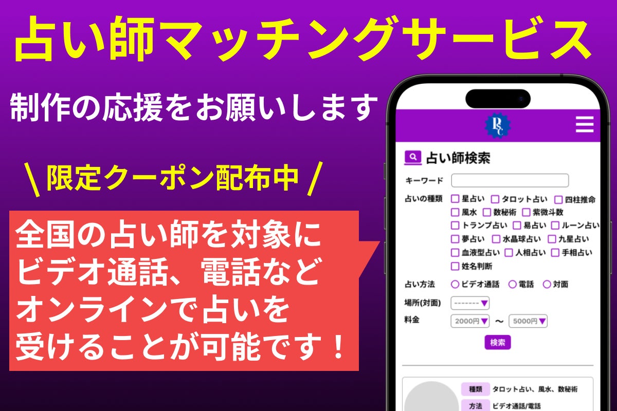 全国各地の占い師から自分好みの占い師を選んで占いをできる占い師マッチング/占い予約プラットフォームを構築したいと考えております。