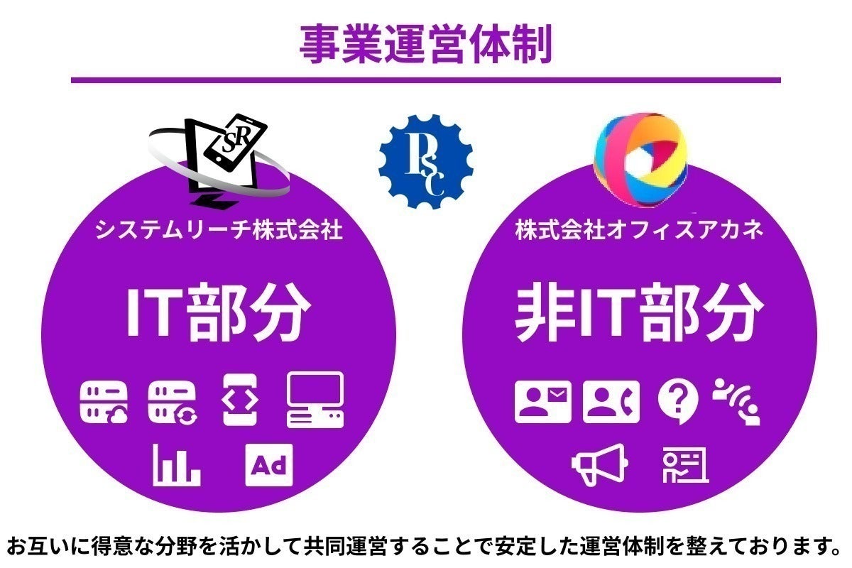 システムリーチ株式会社がIT分野の確かな知見と経験を生かして今回のマッチングプラットフォームのITシステム・データ部分を担当し、株式会社オフィスアカネが事業運営部分を担当することで安定したマッチングプラットフォーム運営環境を築きます。