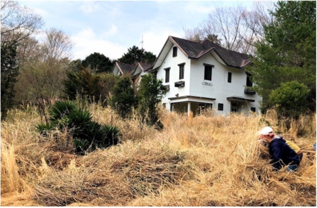 環境教育施設への改修工事を計画している 「mata-ne 村」ですが、初めて土地に踏み込んだ時、元ペンションは草木で覆われ屋根しか見えず藪漕ぎせずに歩けるスペースはほんの50坪程度。残りの4,550坪は木々が生い茂りほとんどの地形が分からないほどでした。そこで、友人達に声をかけボランティアを募り2021年10月『村づくりプロジェクト第一弾!』 スタート!!