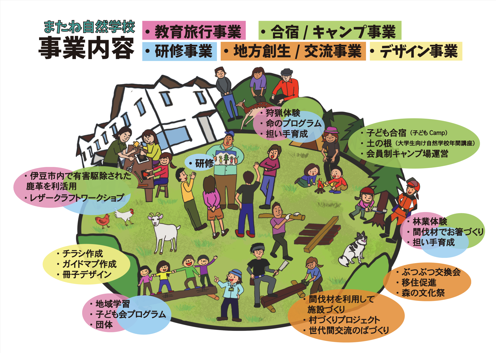 伊豆市内の小中高等学校では地域学習や森林環境教育授業を請負い、より地域に根ざした誰にでも平等な環境教育活動を進めてまいります。
