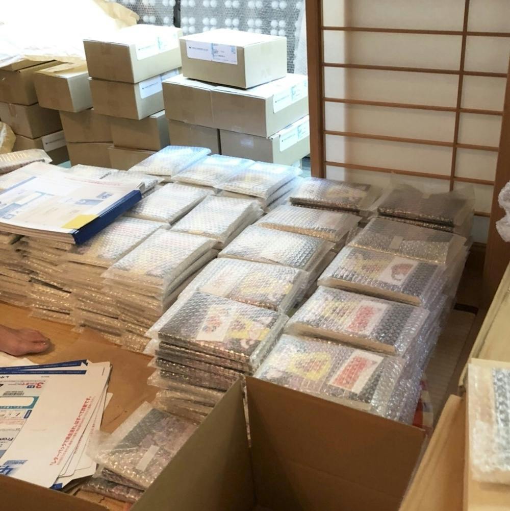 1242名というたくさんのご支援をいただいたおかげで、リターンの数も1242個、なかなか大変な量です。人手にも限りがあるため、何日かに分けて作業を行なっていますが、ようやく終わりが見えてきました。
